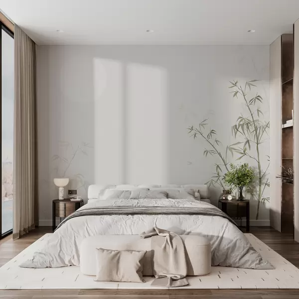 Fototapet Minimalism stil Japandi plante bambus și soare Chinoiserie culoare verde Nr. w00547