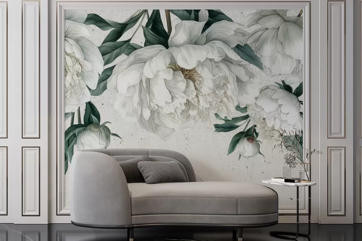 Fototapet Bujori mari albe cu frunze verzi pe un fundal ușor texturat Nr. w00837