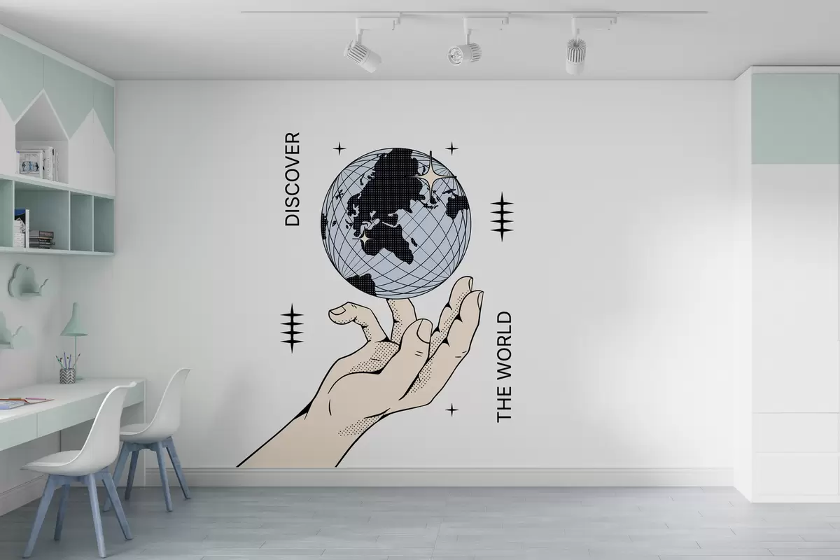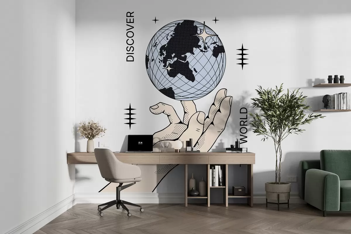 Fototapet Mână bej care învârte globul pe un fundal alb pentru decorarea camerei sau a biroului Nr. w00984