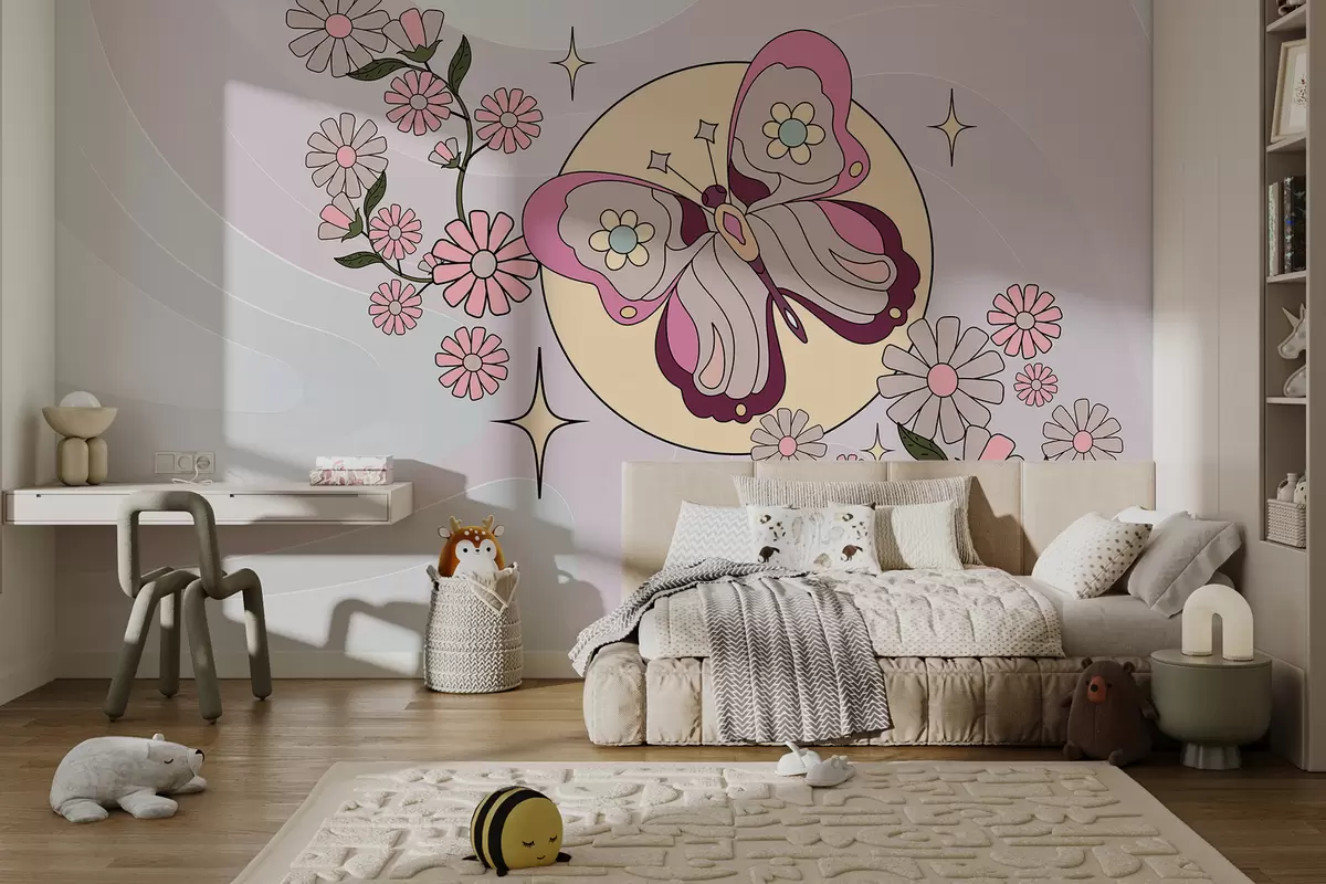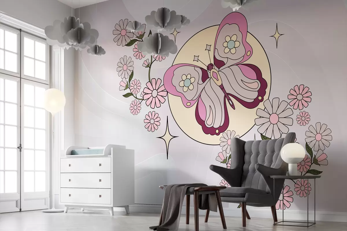 Fototapet tapet cu un fluture roz pe un fundal gri deschis-roz printre flori într-un stil simplu pentru camera unei fete Nr. w00985