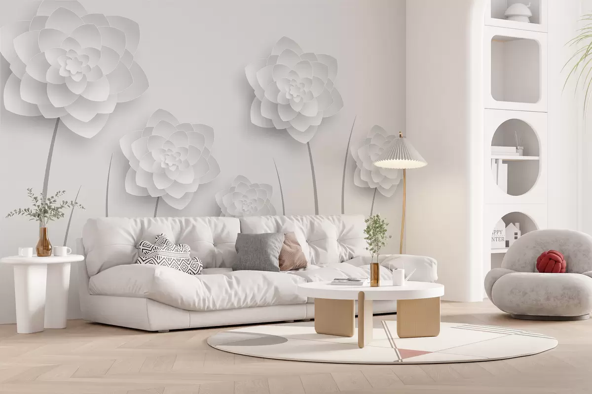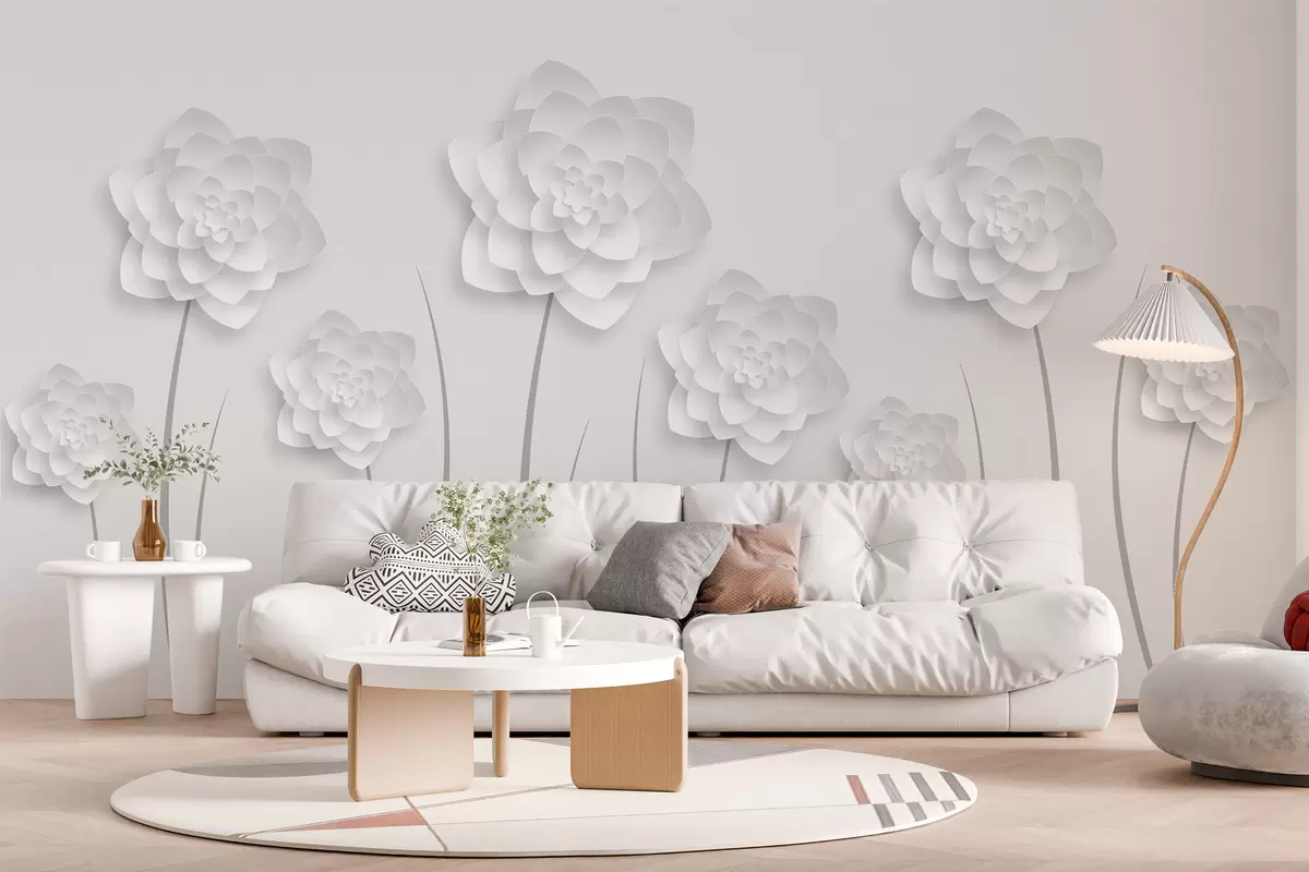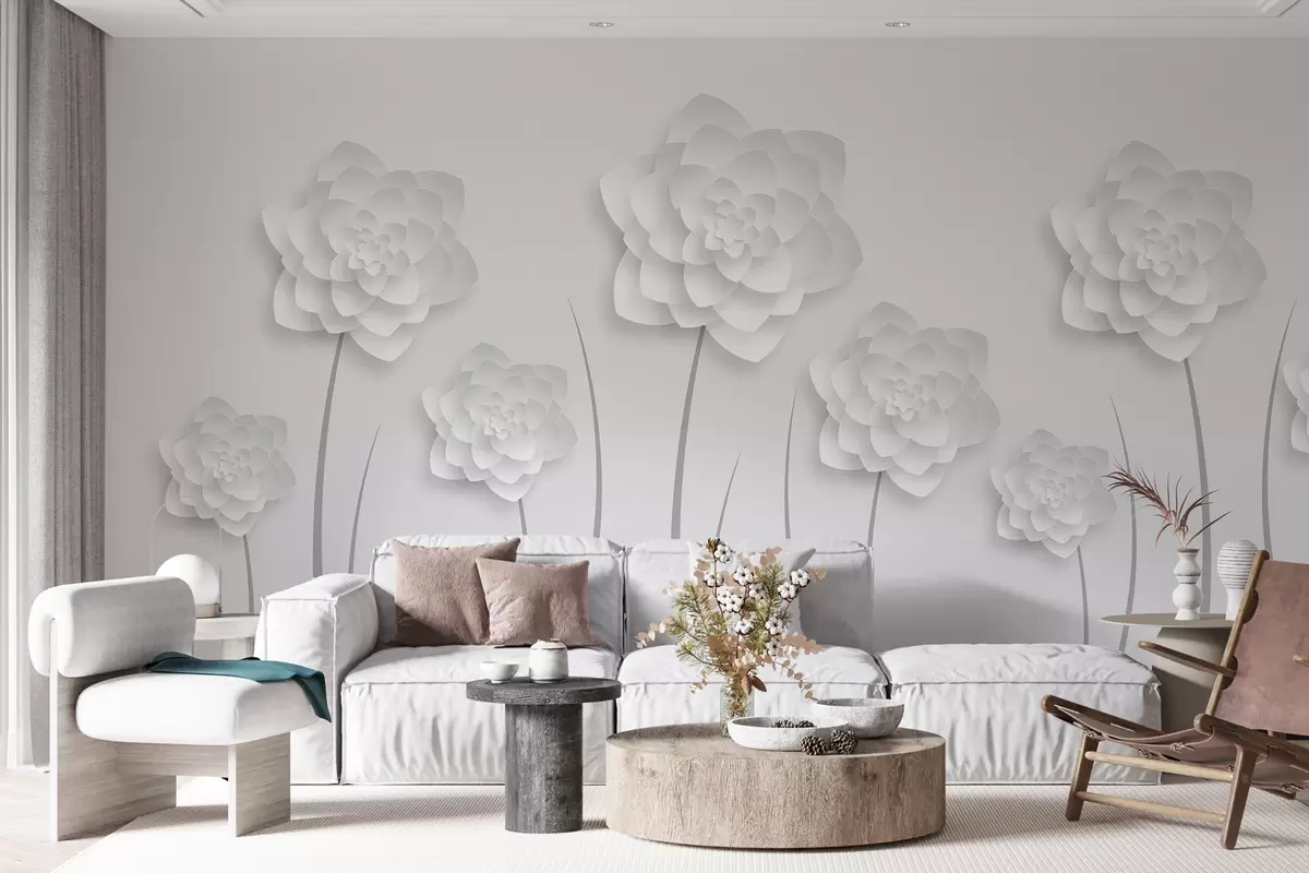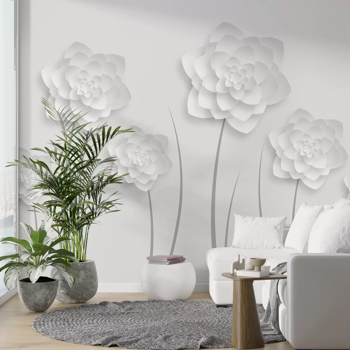 Fototapet Flori mari cu imitație de volum în stil hârtie pe fond gri deschis cu tulpină gri Nr. w01021