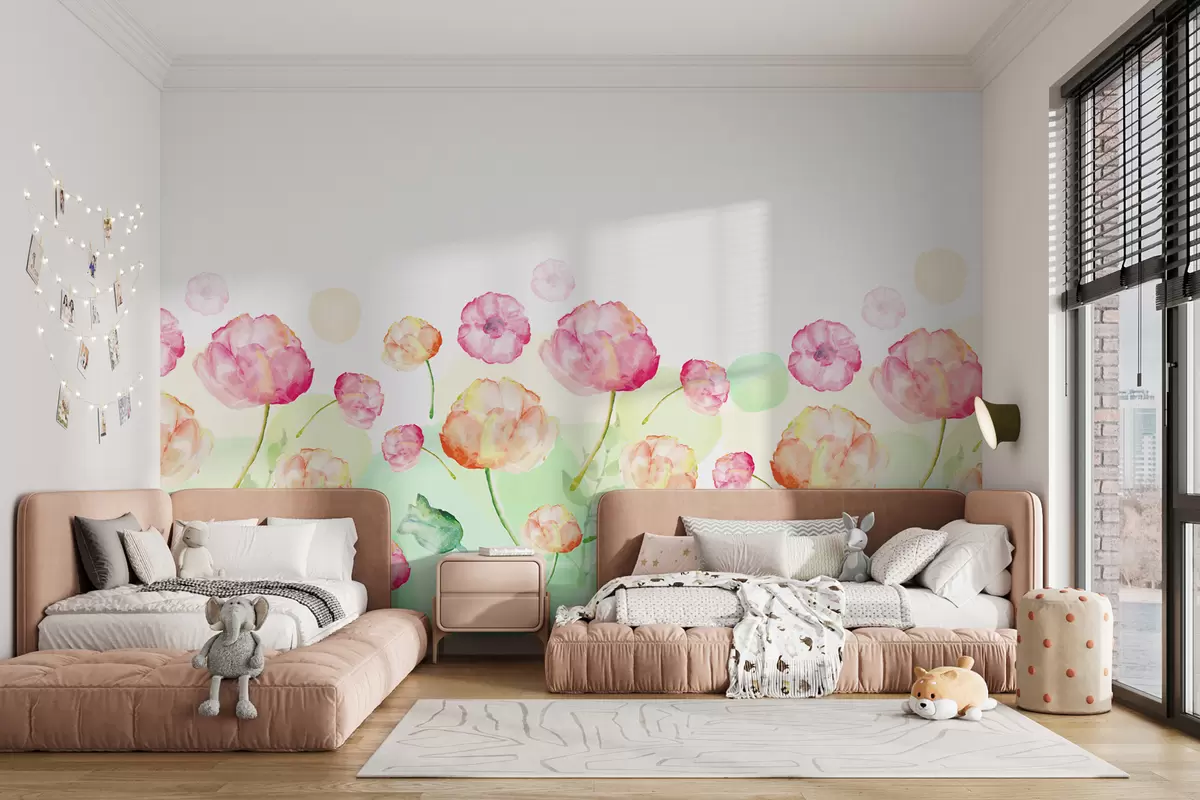 Fototapet lalele rosu-portocaliu si roz in tehnica acuarela pe fond alb cu pete verzi Nr. w01028