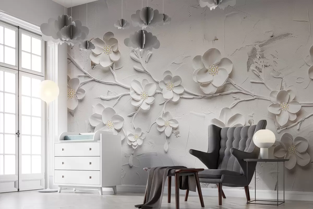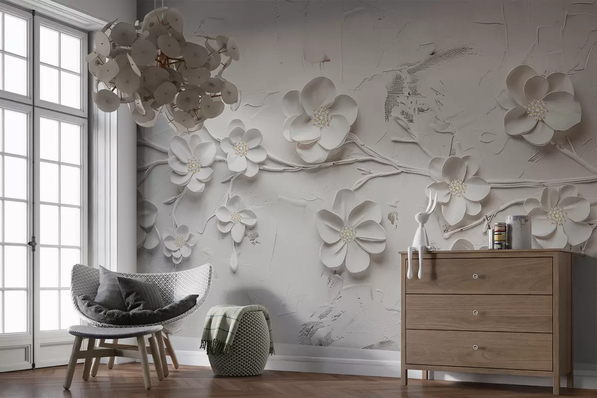 Fototapet Fundal alb texturat cu flori albe 3D în plină înflorire, conectate prin ramuri, minimalist și elegant Nr. w01226