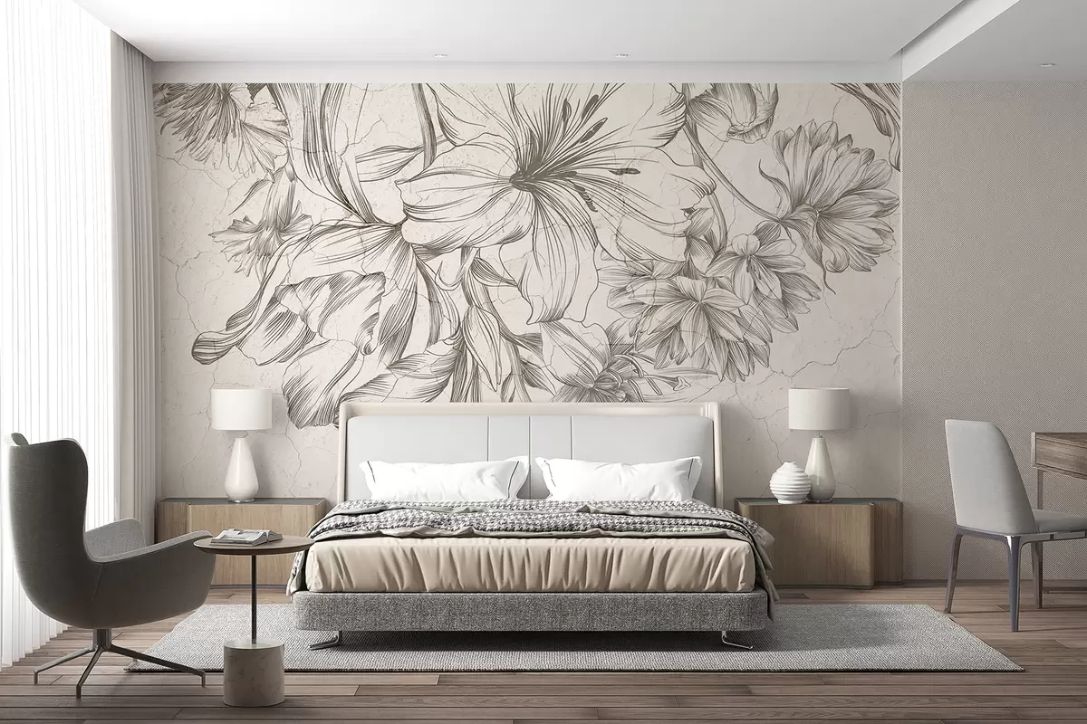 Fototapet O schiță alb-negru grawing de flori mari imprimare grafică Nr. w01253