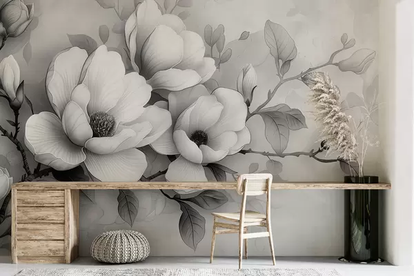 Fototapet O ilustrație alb-negru a unei magnolii pe un fundal gri Nr. w01277