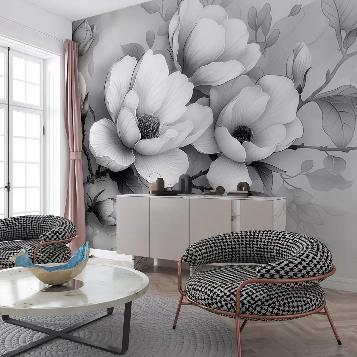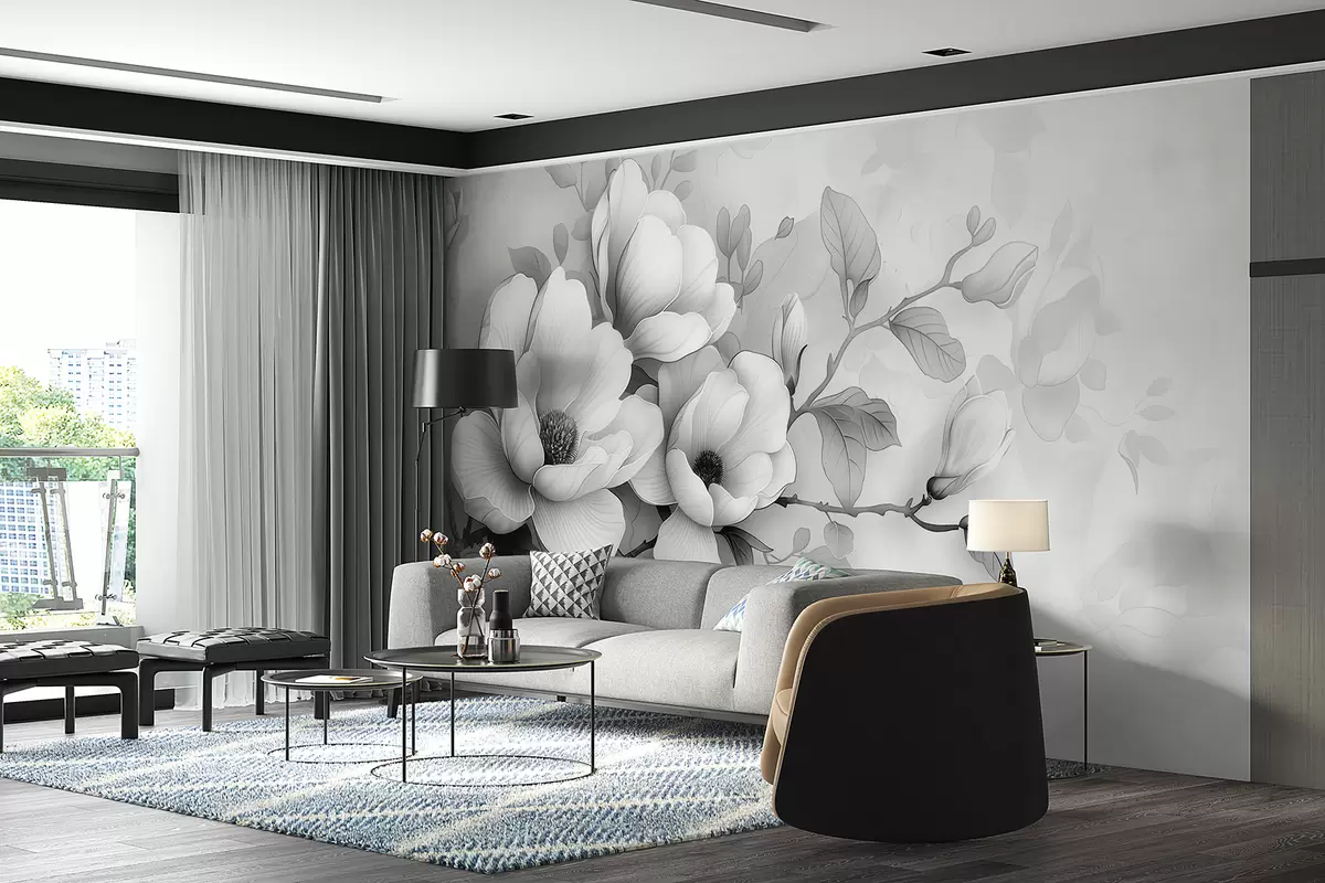 Fototapet O ilustrație alb-negru a unei magnolii pe un fundal gri Nr. w01277