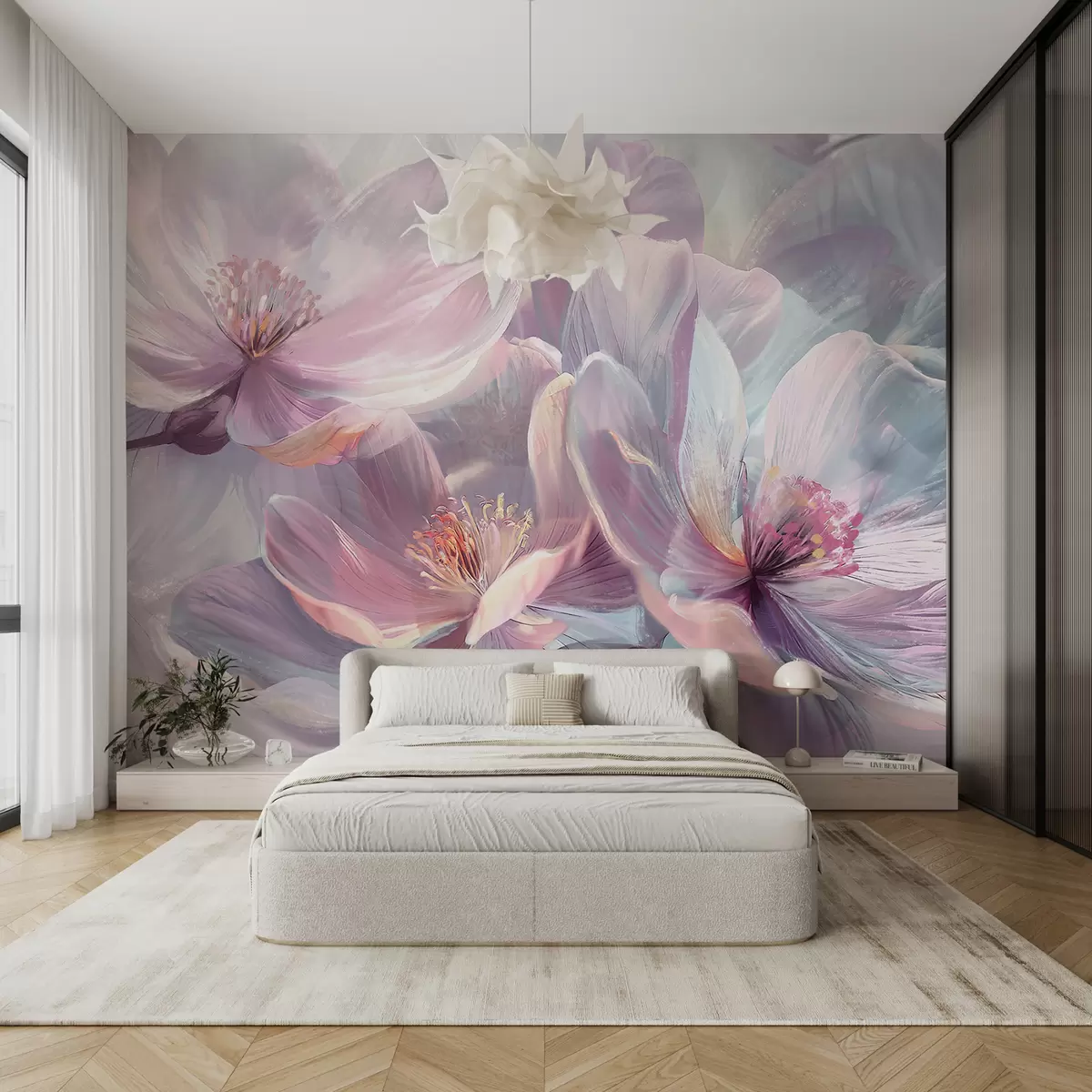 Fototapet Delicate transparente pastel neon lumina roz și flori albe cu fundal moale, neclare Nr. w01307