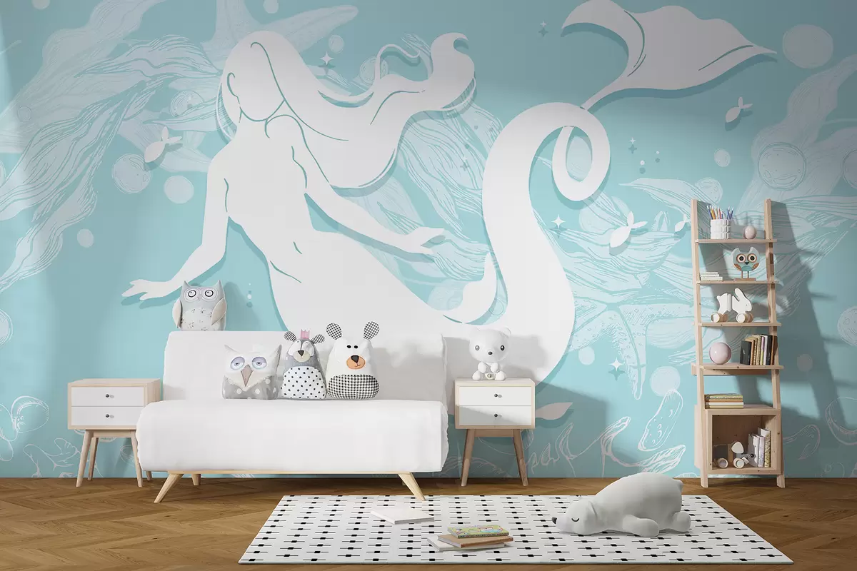 Fototapet O sirenă albă cu păr lung care curge înotând într-un ocean albastru deschis cu valuri albe și bule Nr. w01316