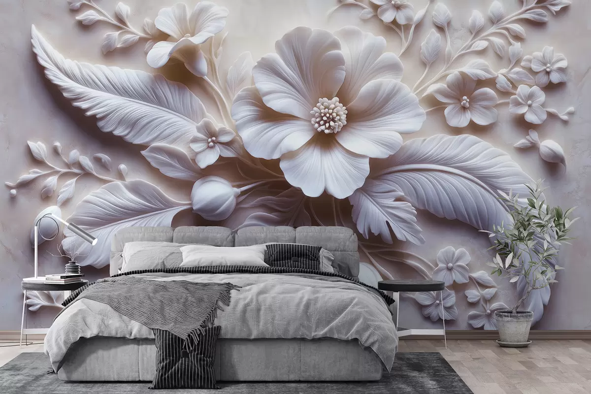 Fototapet artă de perete 3D în relief cu pene și flori, cu un mac mare în culori roz deschis Nr. w01340v1