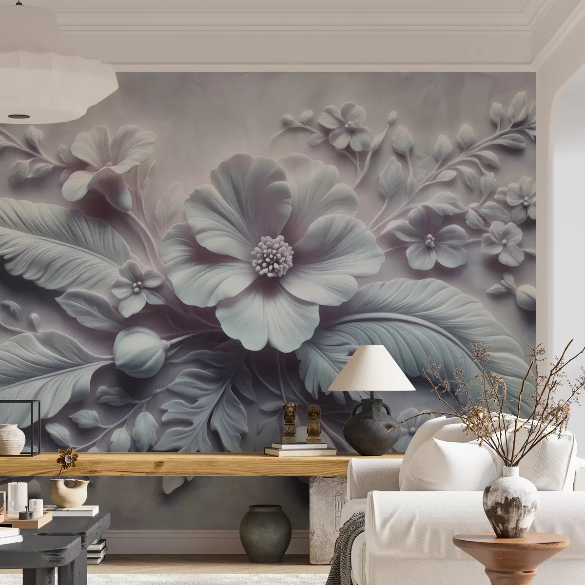 Fototapet artă de perete în relief 3D cu pene și flori, cu un mac mare în culori albastru deschis Nr. w01340v2