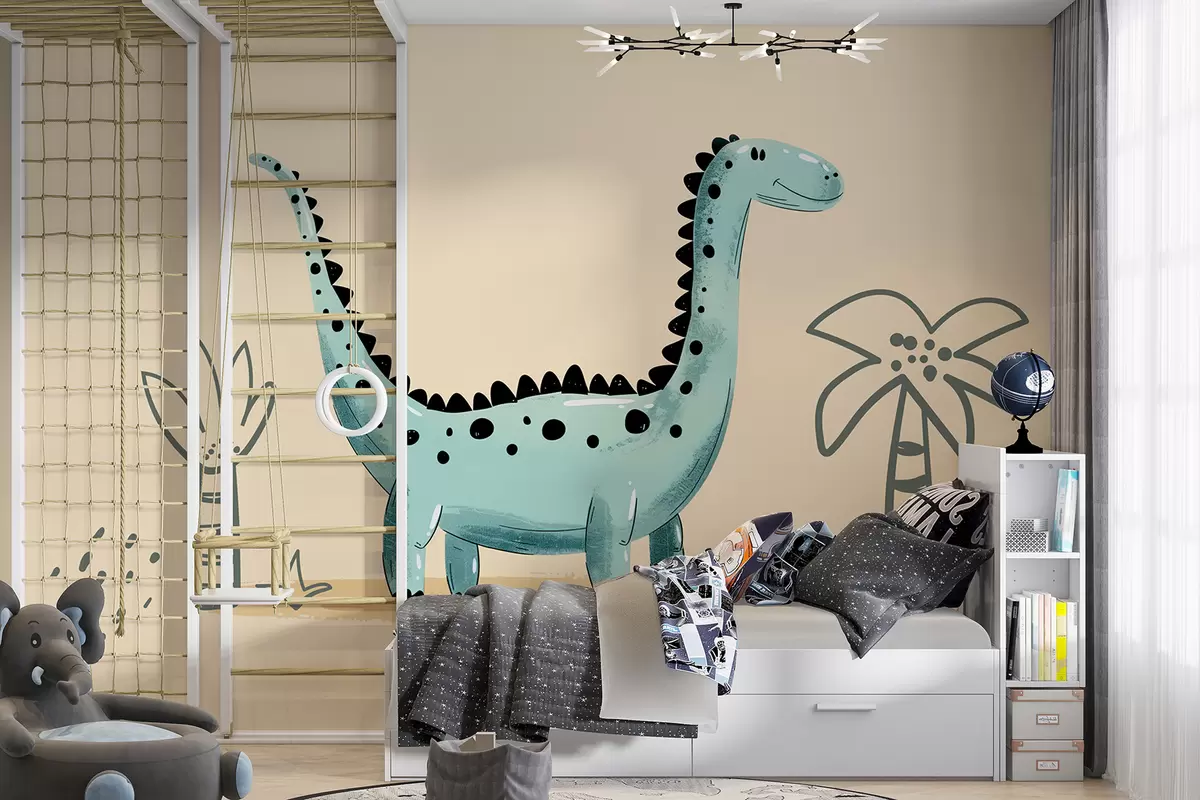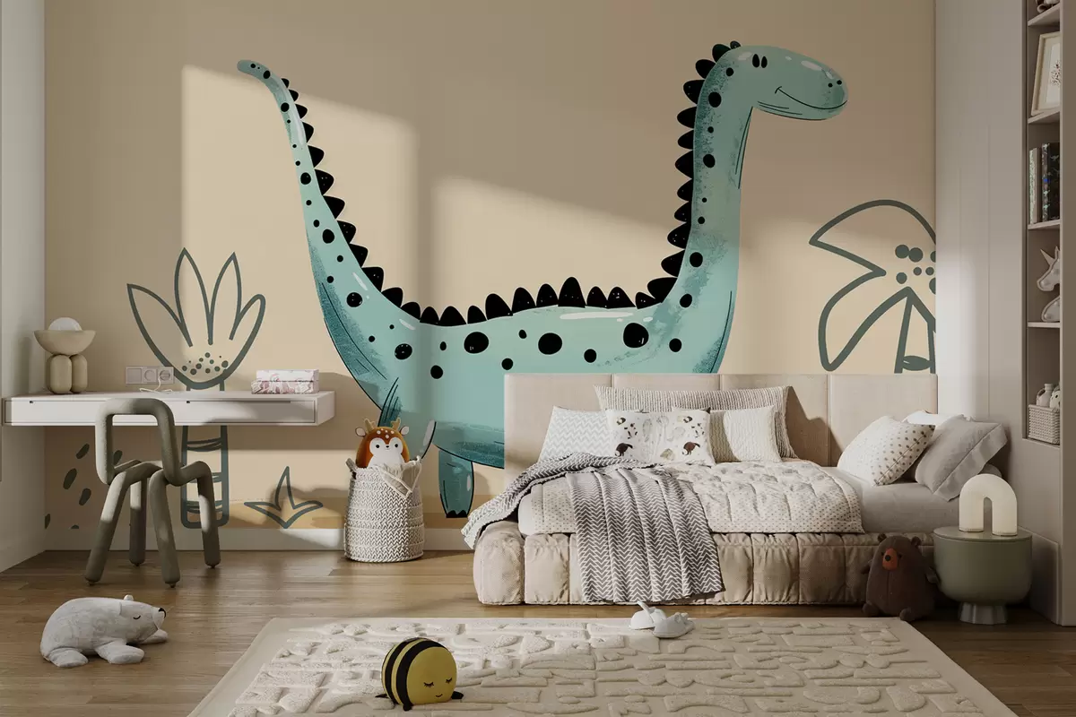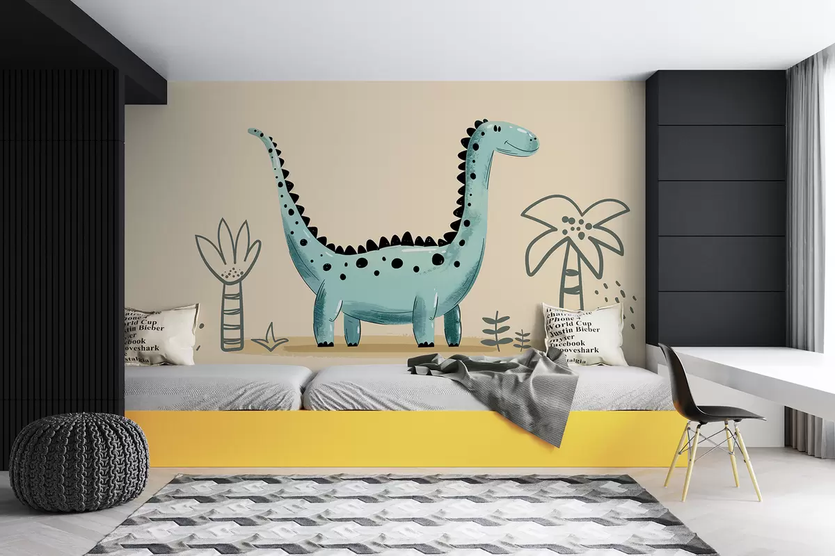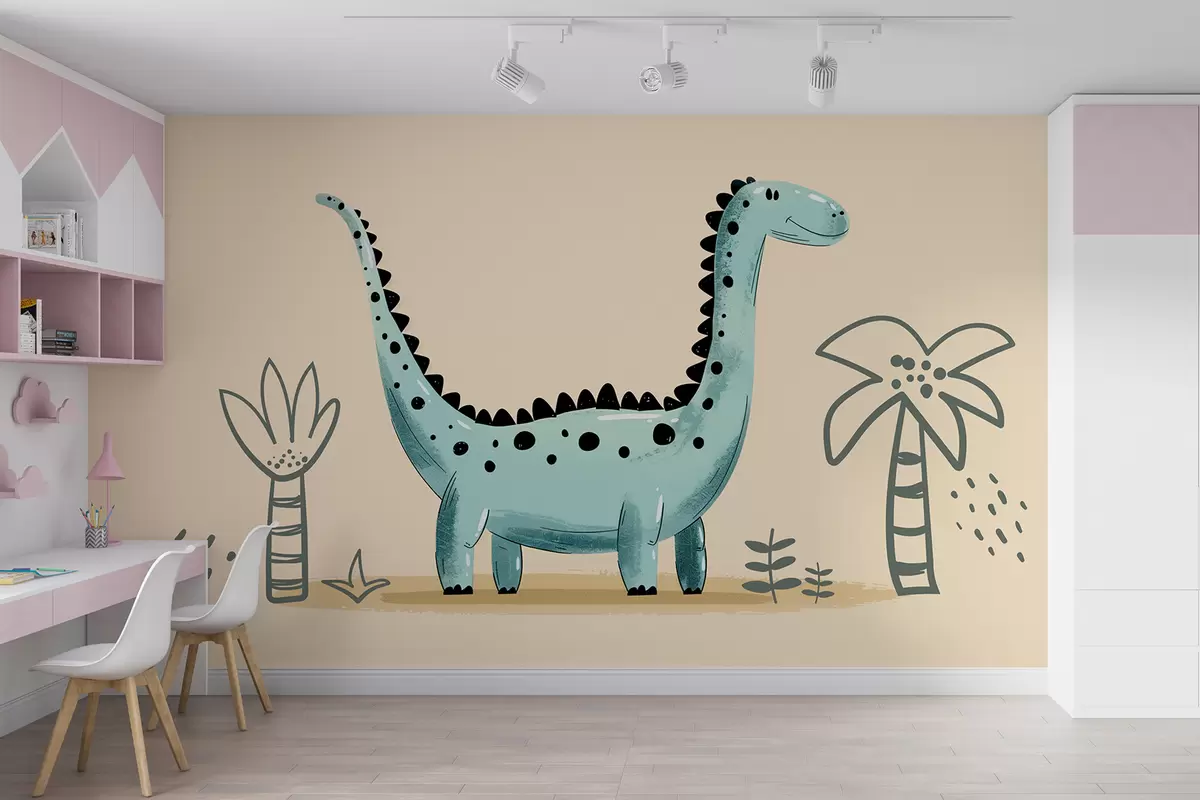 Fototapet Drăguț dinozaur pe un fundal bej cu palmieri Nr. w01357v1