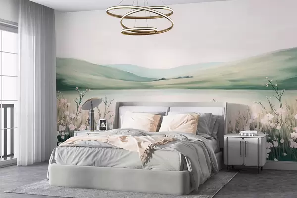 Fototapet Pajiște de flori, peisaj natural, lac, flori roz, dealuri verzi Nr. w01387