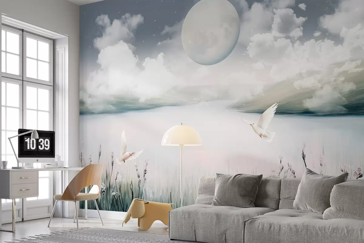 Fototapet Peisaj frumos cu lac, pajiște de flori, lună pe cerul înstelat de noapte, păsări zburătoare, nori Nr. w01389