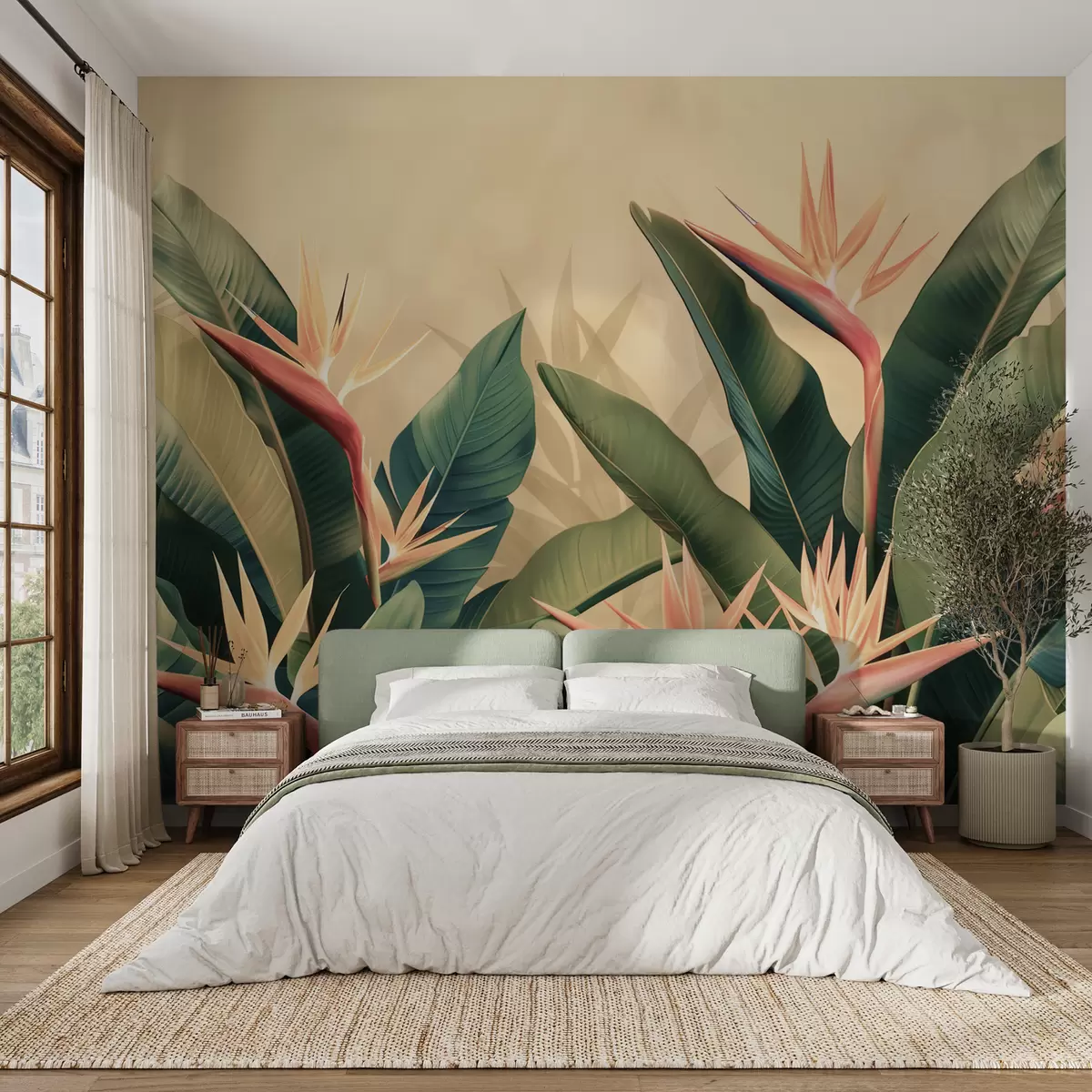 Fototapet Aranjament luxuriant de flori tropicale, înconjurat de frunze mari de culoare verde închis Nr. w01484v1