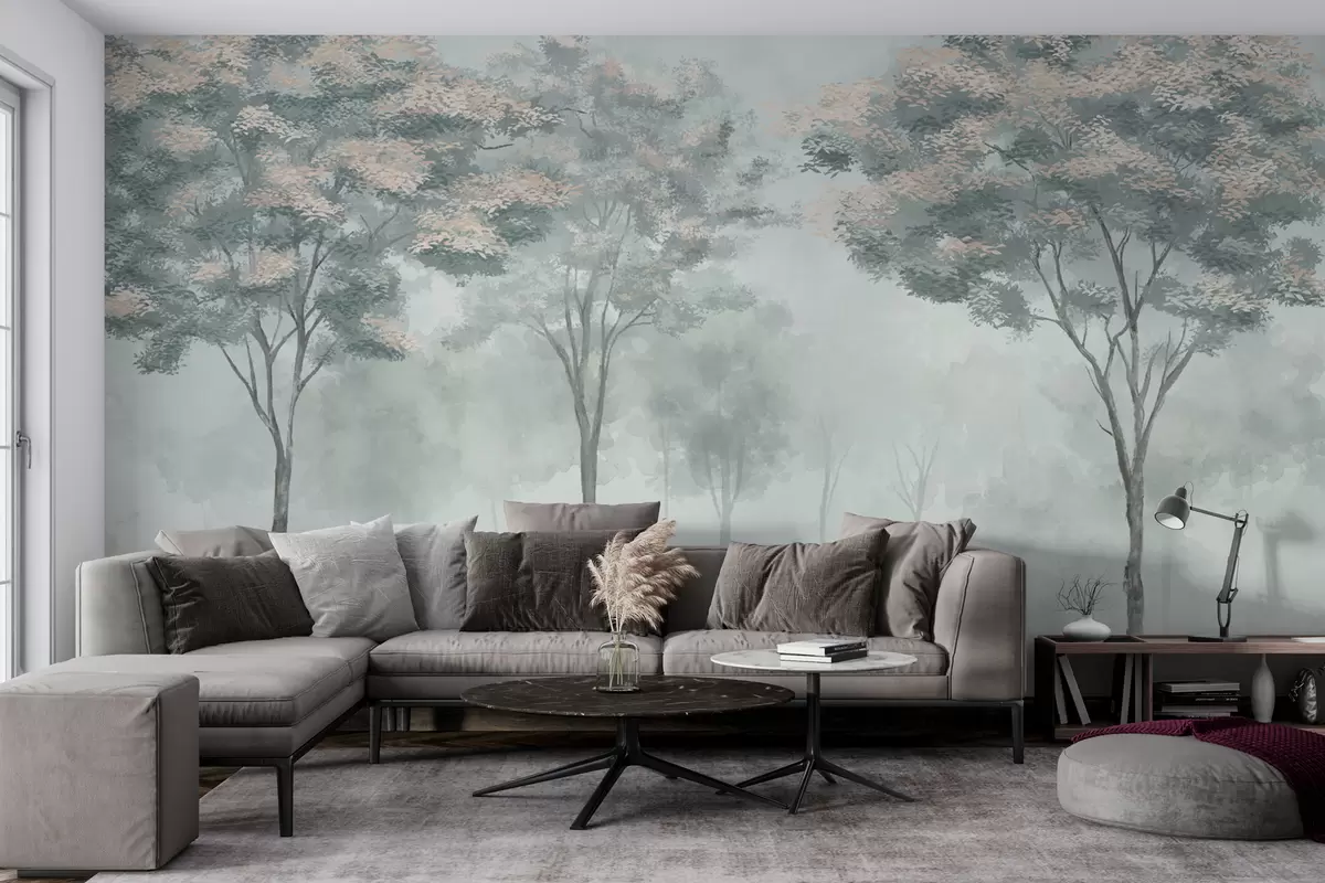 Fototapet Siluetă de pădure cețoasă în culorile verde, gri deschis și bej Nr. w01599