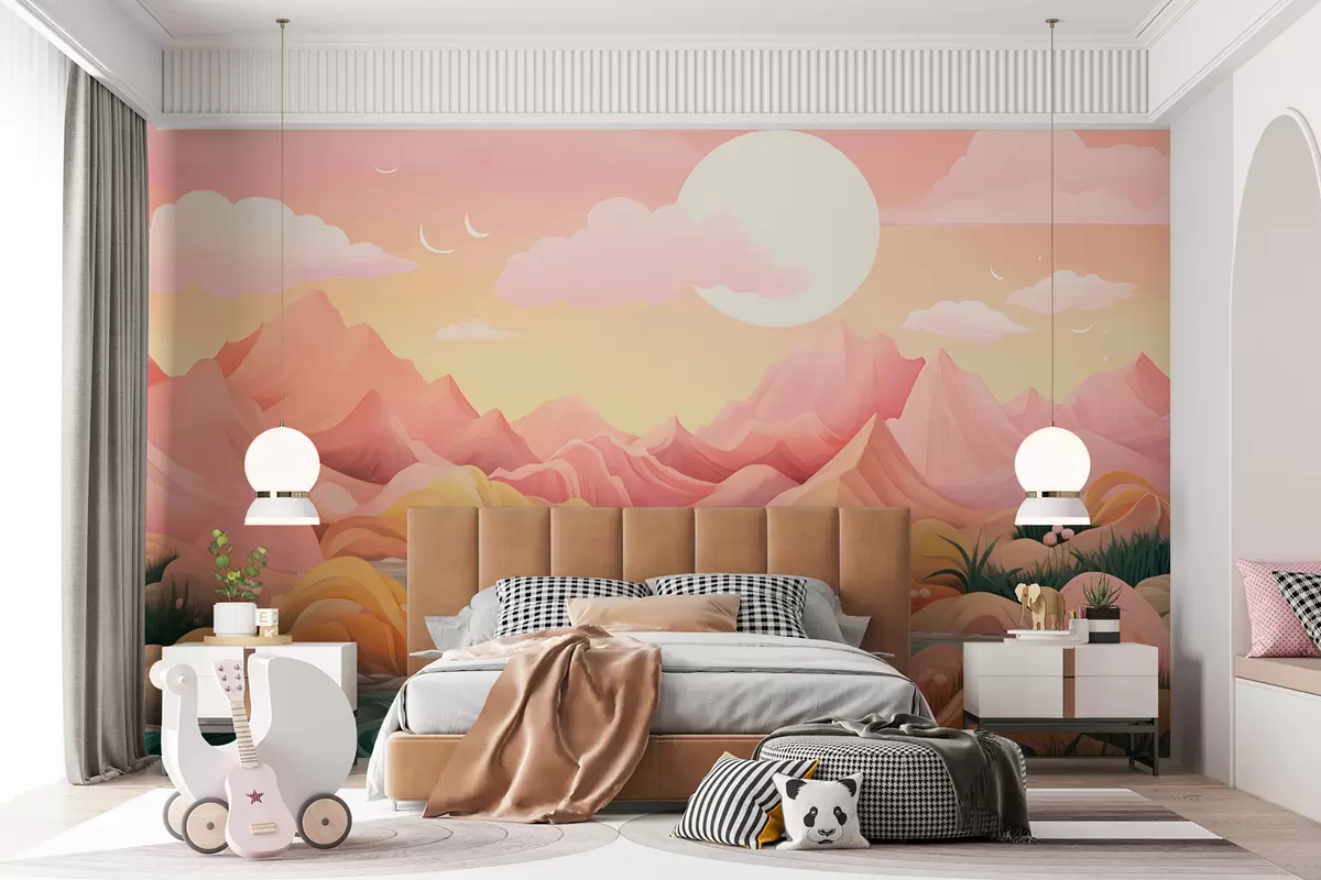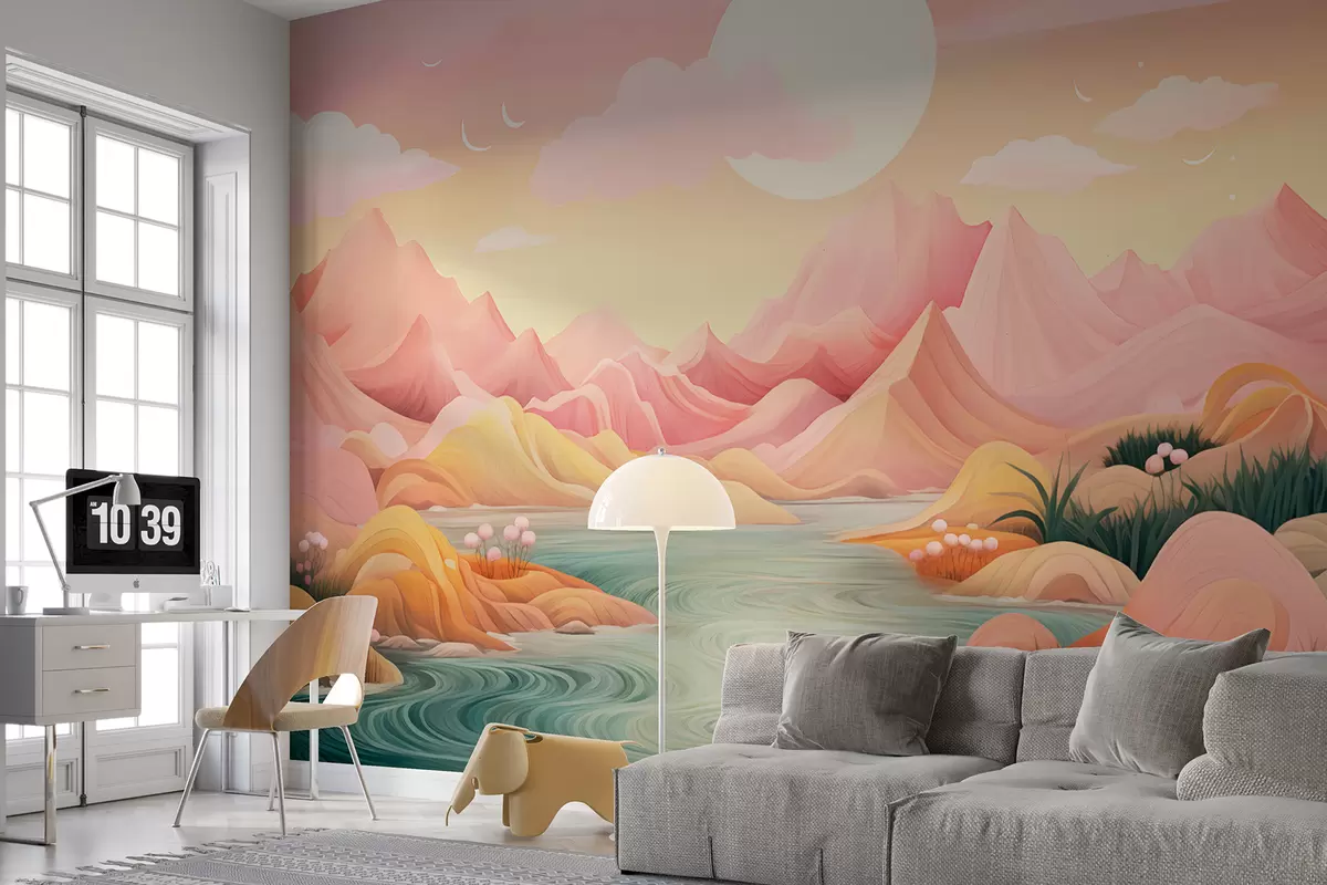 Fototapet Peisaj fantastic, în culori pastelate, cu munți roz și piersici moi Nr. w01656