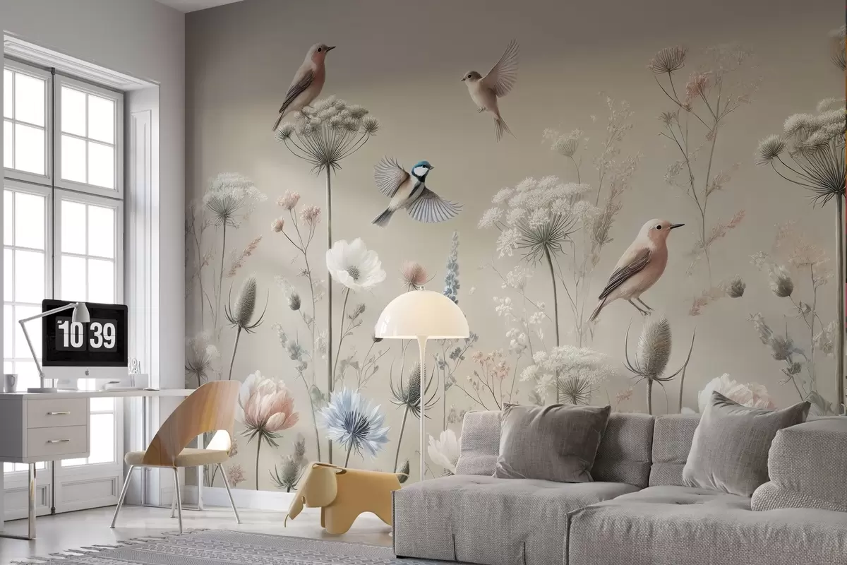 Fototapet Delicate flori sălbatice cu păsări pe un fundal bej Nr. w01958