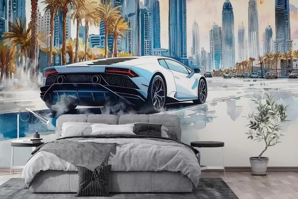 Fototapet O mașină sport modernă albă de curse pe fundal de palmieri și zgârie-nori în tehnica acuarelă liberă Nr. w01963