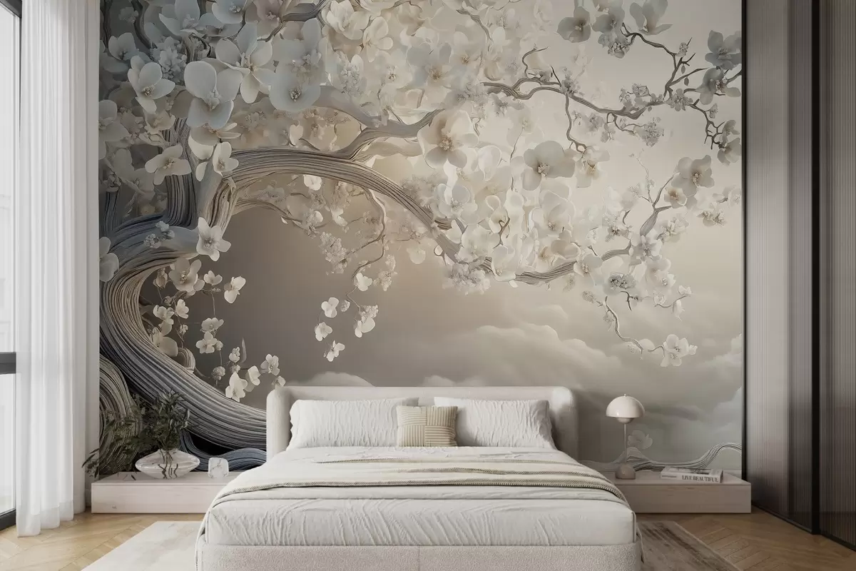 Fototapet Un copac fermecător cu flori albe pe fundal de nori într-un stil interesant în culori calde delicate Nr. w02133