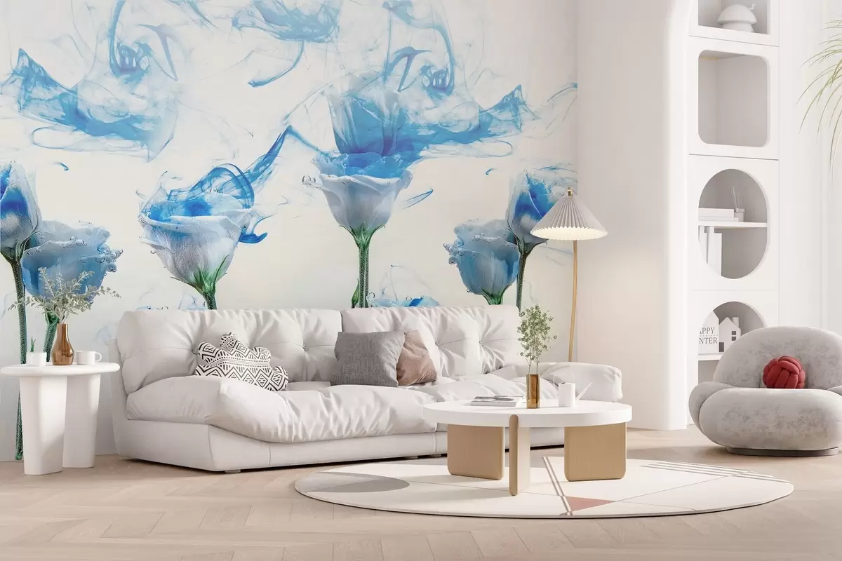 Fototapet Trandafiri albi sub apă pe un fundal alb cu dungi de vopsea acrilică albastră. Nr. w02139
