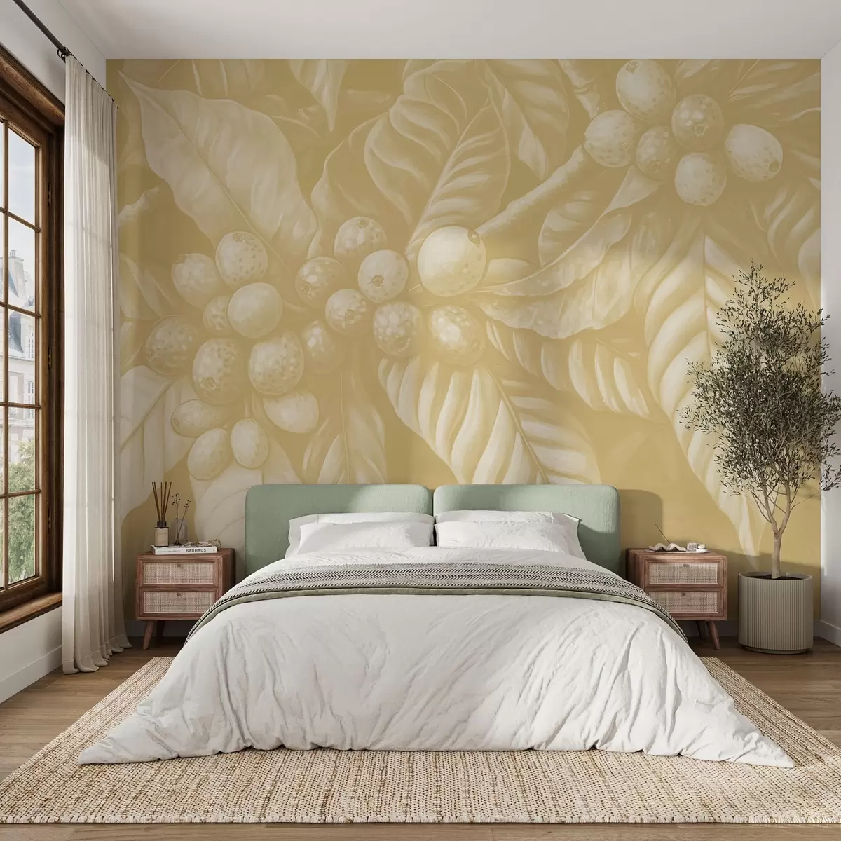 Fototapet Ramuri de plante de cafea cu fructe și elemente tropicale în nuanțe de bej Nr. w02209v1