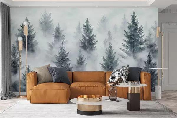 Fototapet Pădure frumoasă cu pini, ceață, peisaje naturale, culori gri Nr. w02222v2