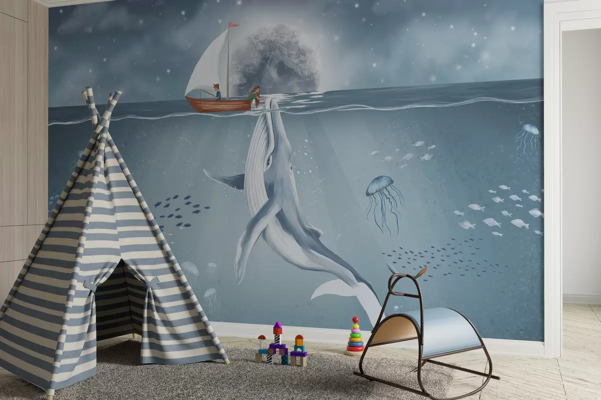 Fototapet Design pentru copii cu balenă, lună și barcă cu copii Nr. w02476