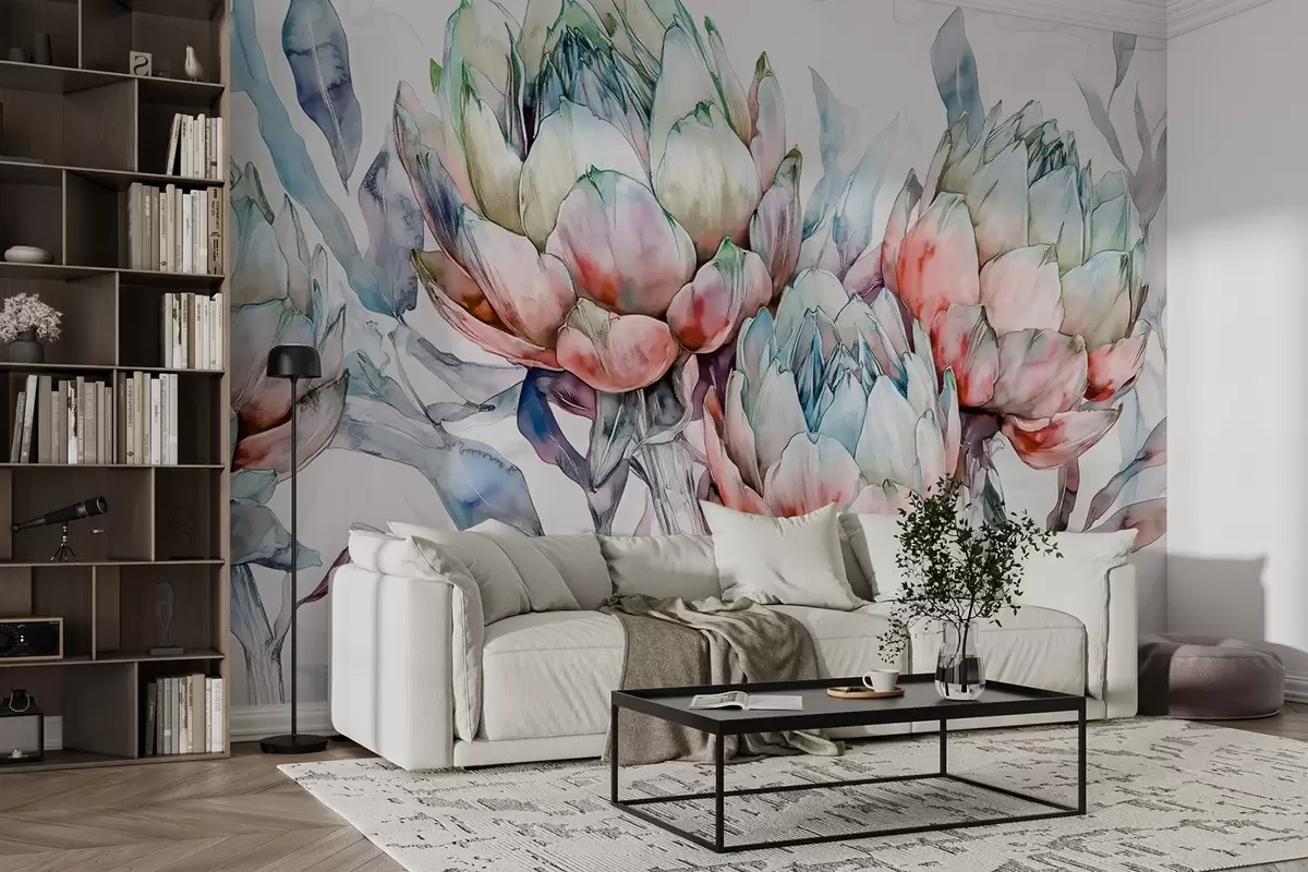 Fototapet Desen anghinare, stil acuarelă, floral, roșu, violet, verde Nr. w02484v1