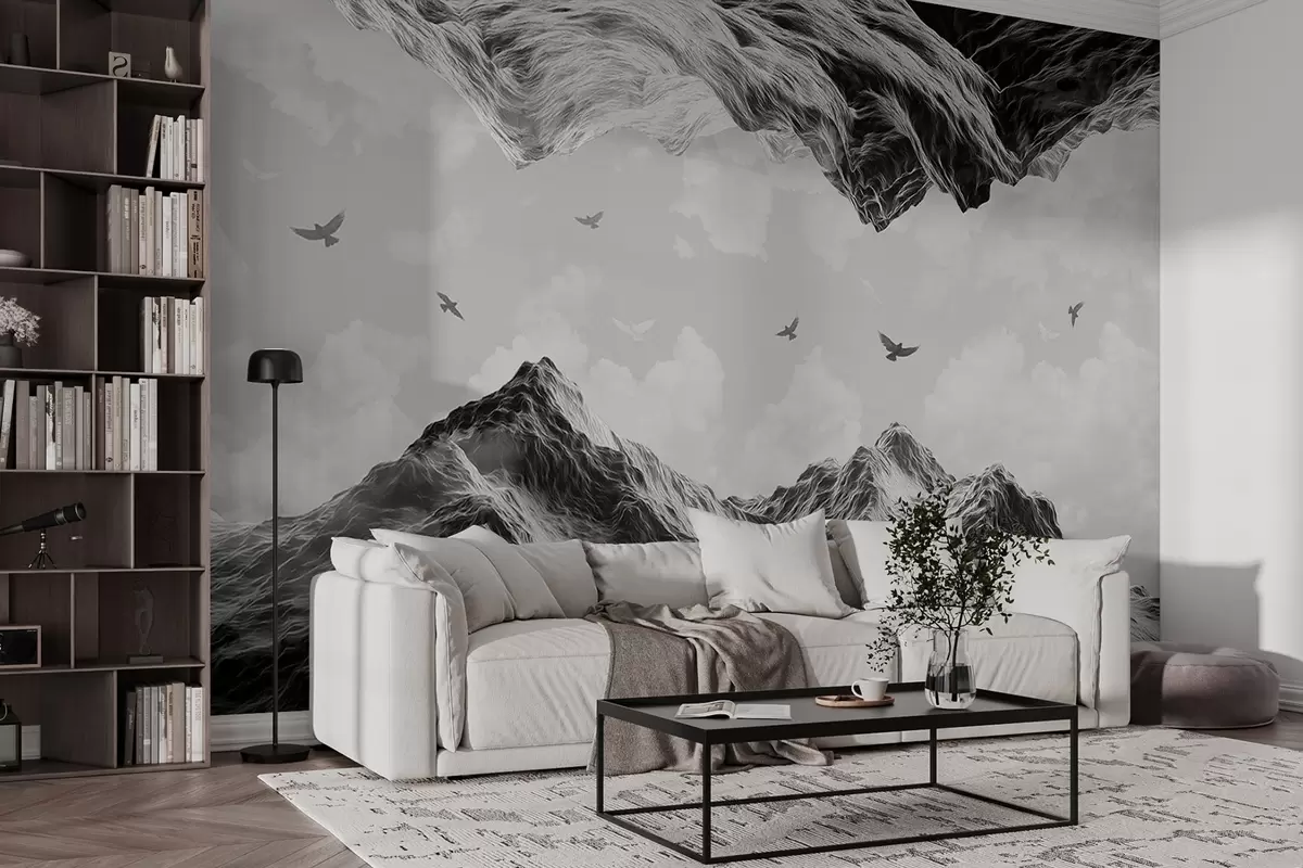 fototapet Munți peisaj, realism, zbor păsări, natură, nori, culori alb-negru w02514