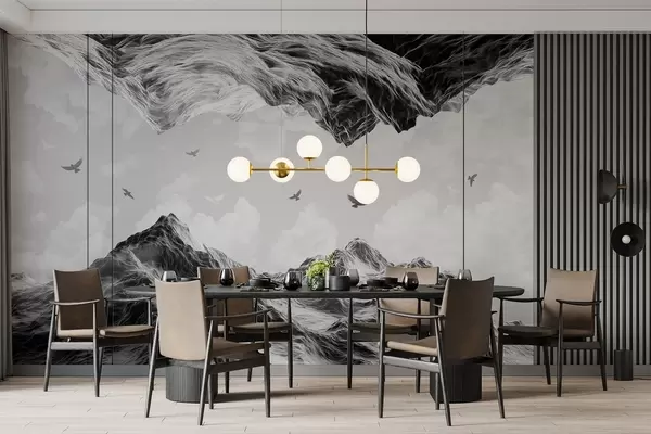 Fototapet Munți peisaj, realism, zbor păsări, natură, nori, culori alb-negru Nr. w02514