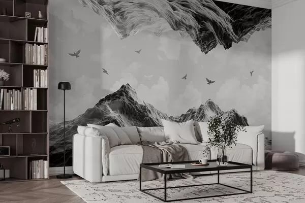 Fototapet Munți peisaj, realism, zbor păsări, natură, nori, culori alb-negru Nr. w02514