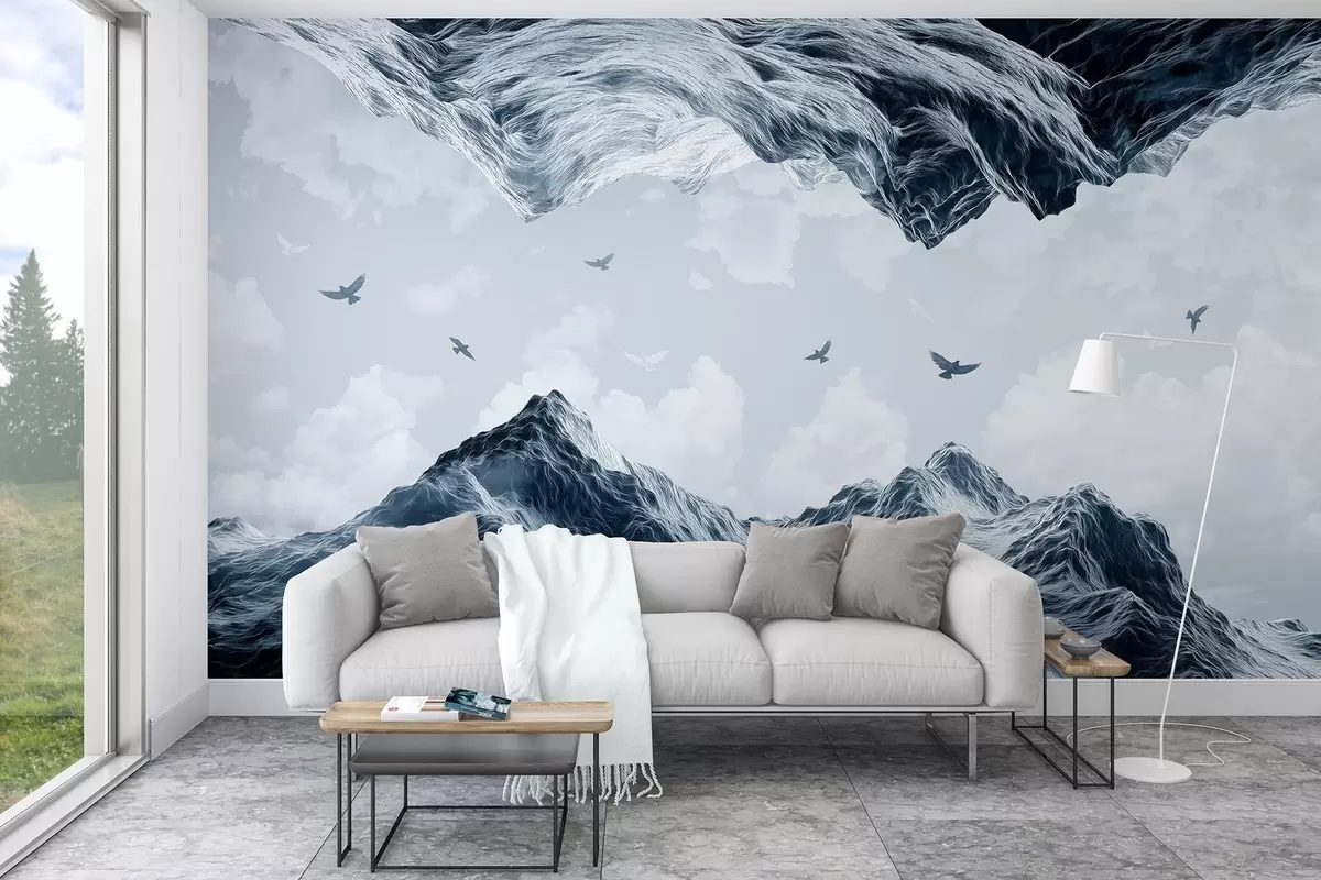 Fototapet Munți peisaj, realism, zbor păsări, natura, nori, culori albastre Nr. w02514v1