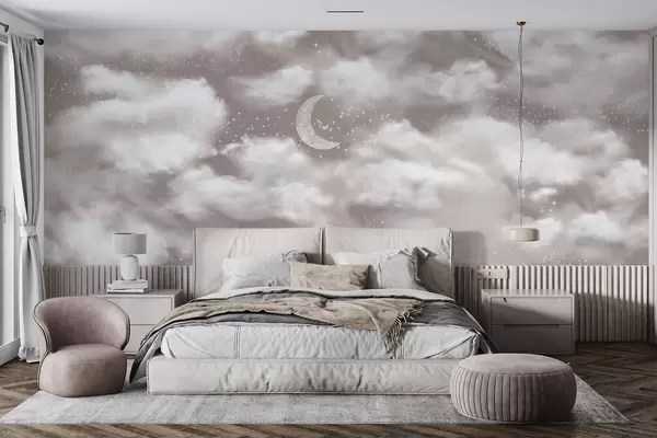 Fototapet Cer înstelat cu lună și nori, visător, eteric, culori bej moi Nr. w02515