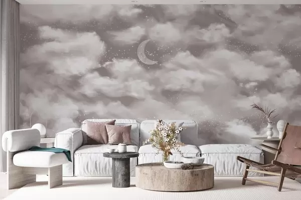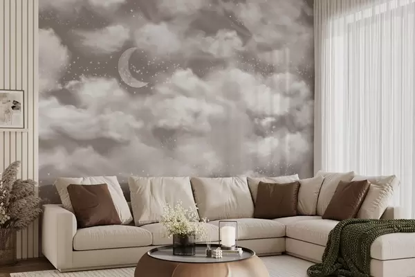 Fototapet Cer înstelat cu lună și nori, visător, eteric, culori bej moi Nr. w02515