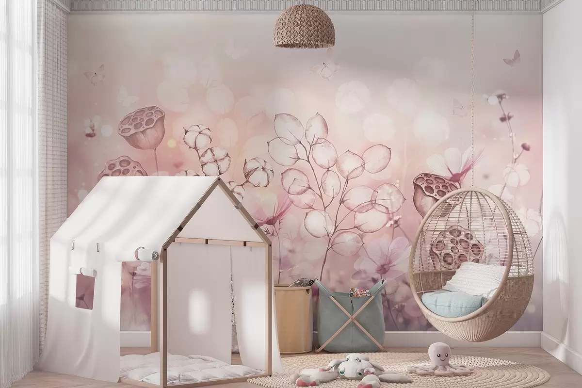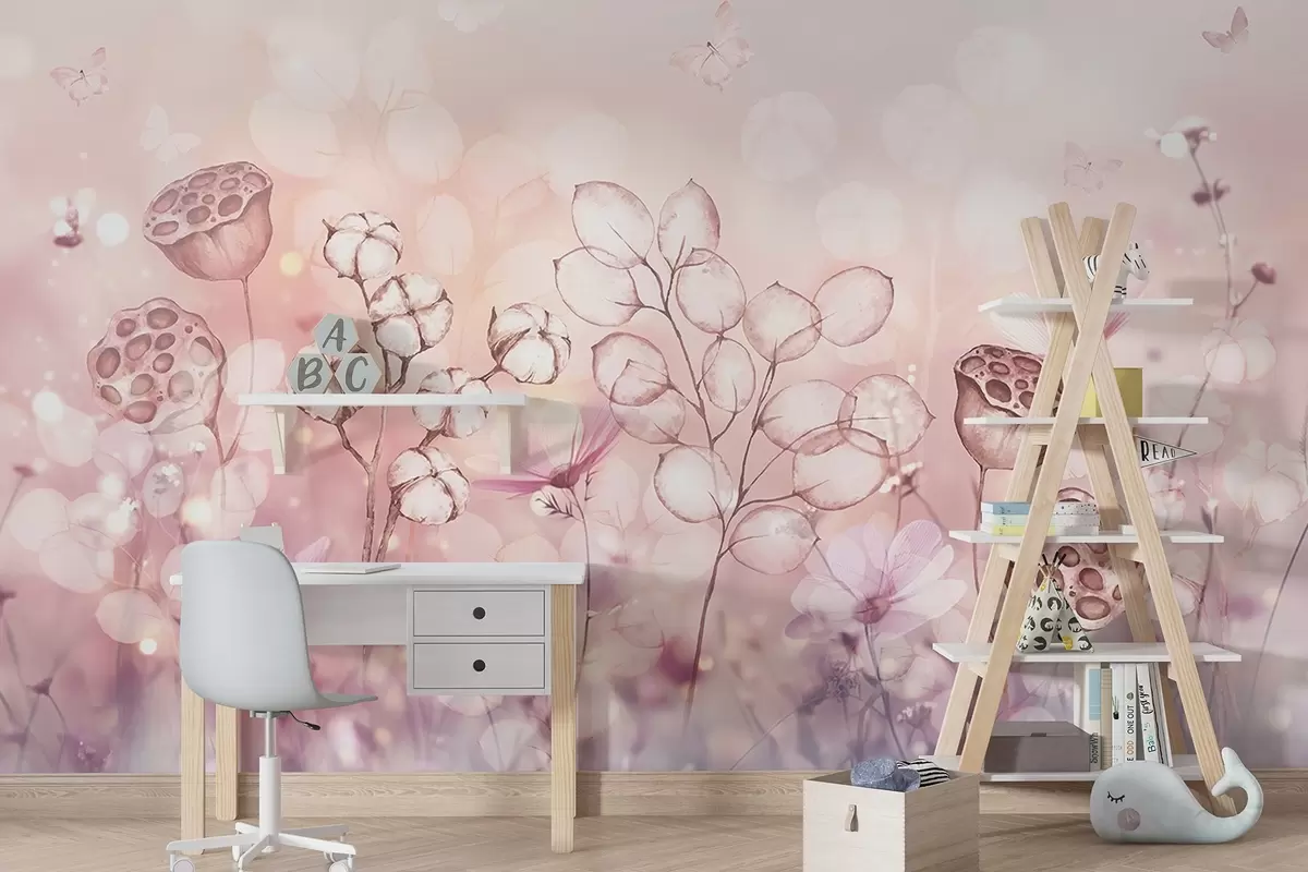 Fototapet Grădină de flori visătoare, fluture, flori de bumbac, lotus, culori roz Nr. w02516