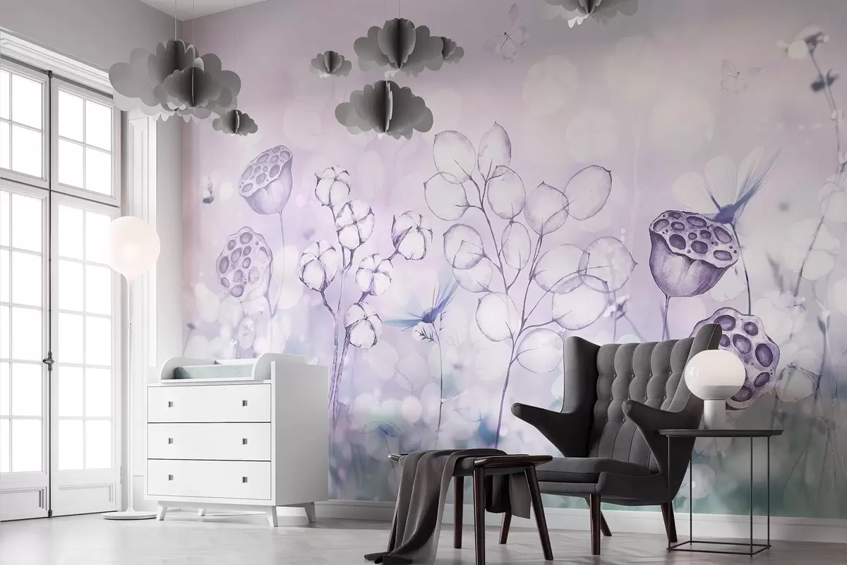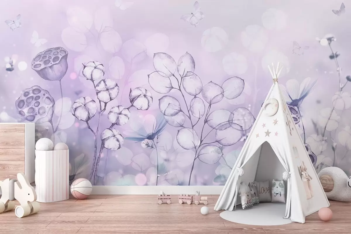 Fototapet Grădină de flori visătoare, fluture, flori de bumbac, lotusuri, culori mov Nr. w02516v1