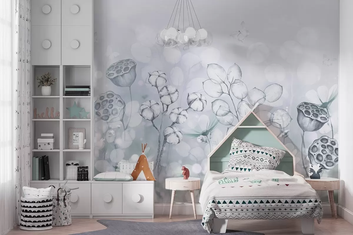Fototapet Grădină de flori visătoare, fluture, flori de bumbac, lotus, culori gri Nr. w02516v2