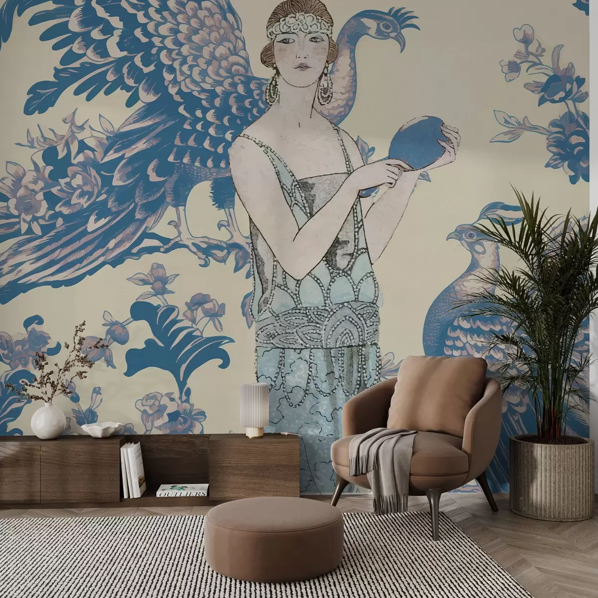 Fototapet Model floral vintage elegant cu o femeie în nuanțe de albastru și roz Nr. w02532