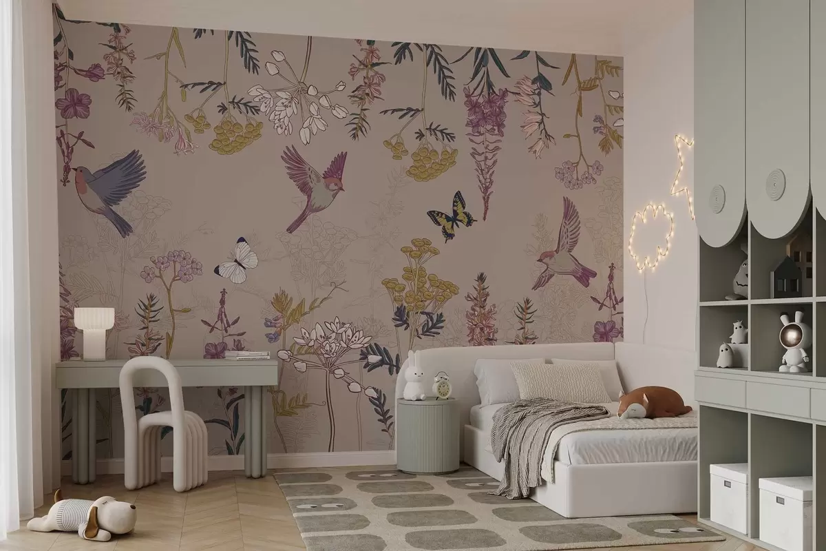 Fototapet un ansamblu de flori sălbatice și păsări pe un fundal bej Nr. w02634