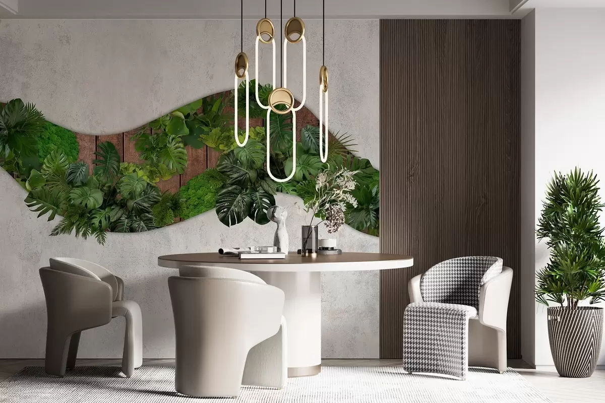 Fototapet Ornament de perete cu plante, mușchi, frunze de palmier, fundal de lemn Nr. w02658