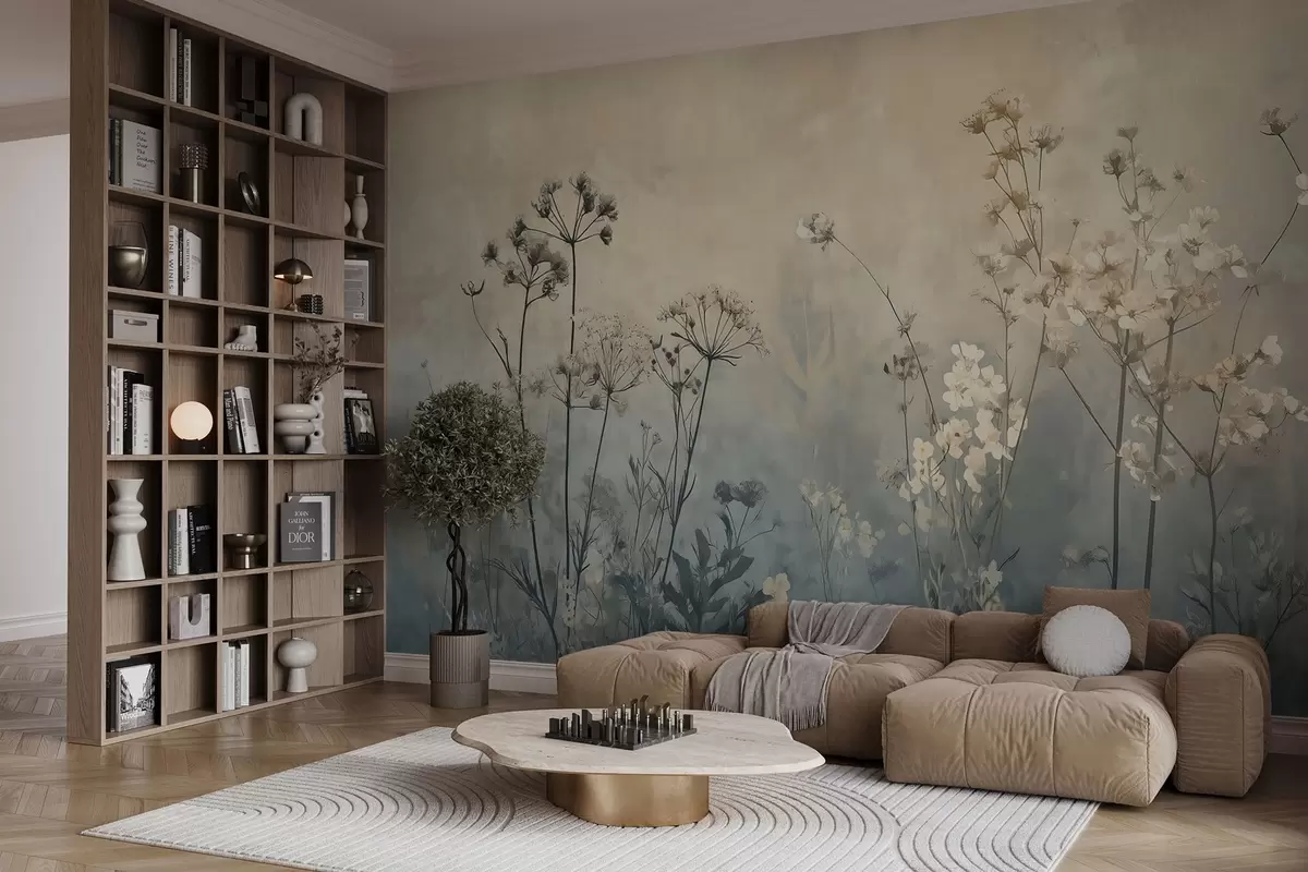 Fototapet tapet în stil ecologic cu flori sălbatice și plante pe un fundal texturat Nr. w02685