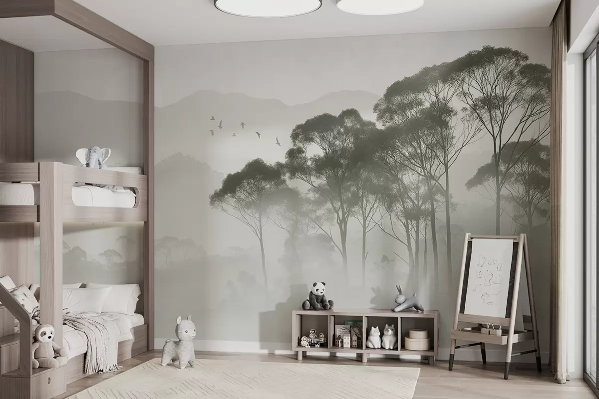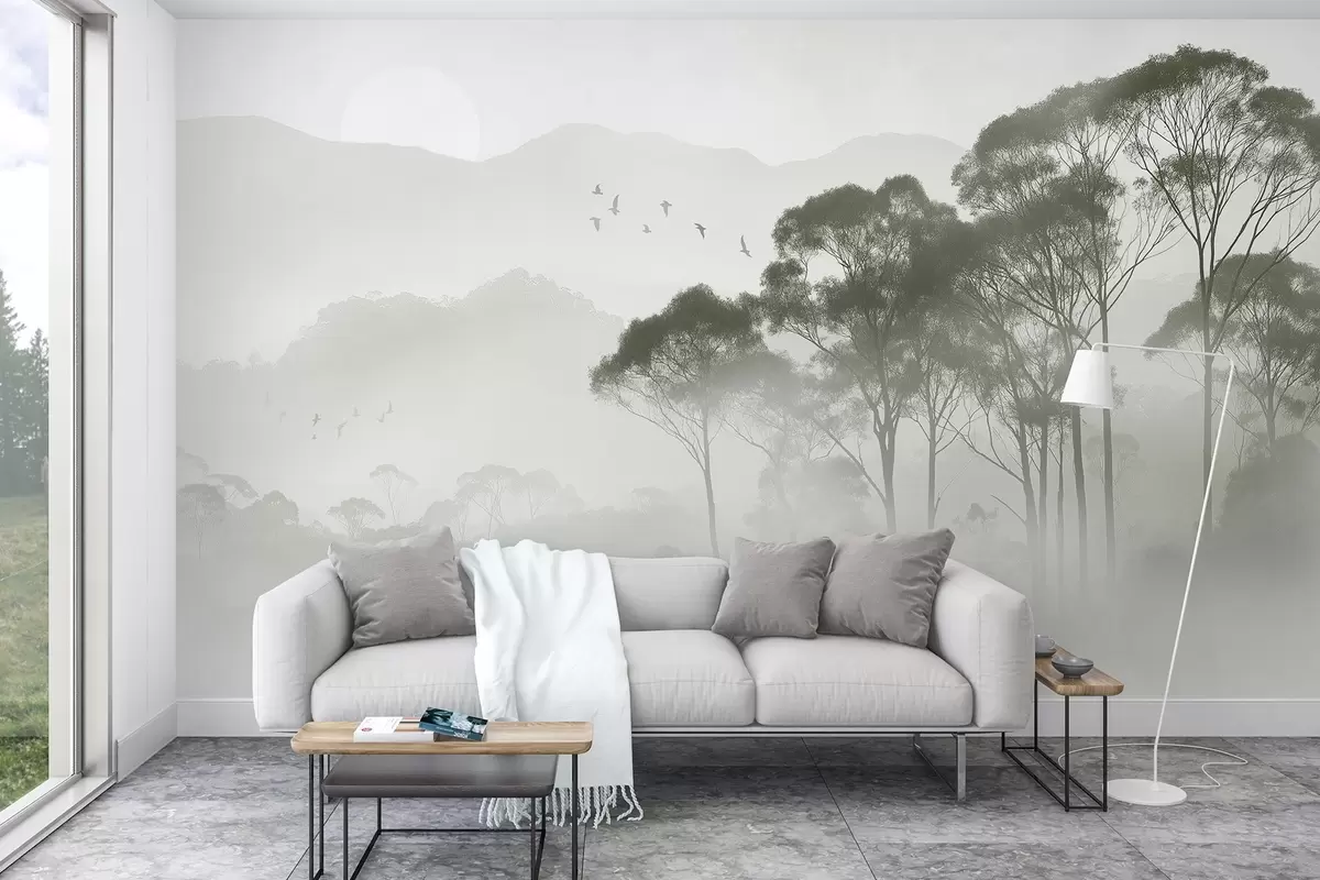 Fototapet Copaci în ceață, peisaje naturale, păsări, soare, culori verzi Nr. w02740