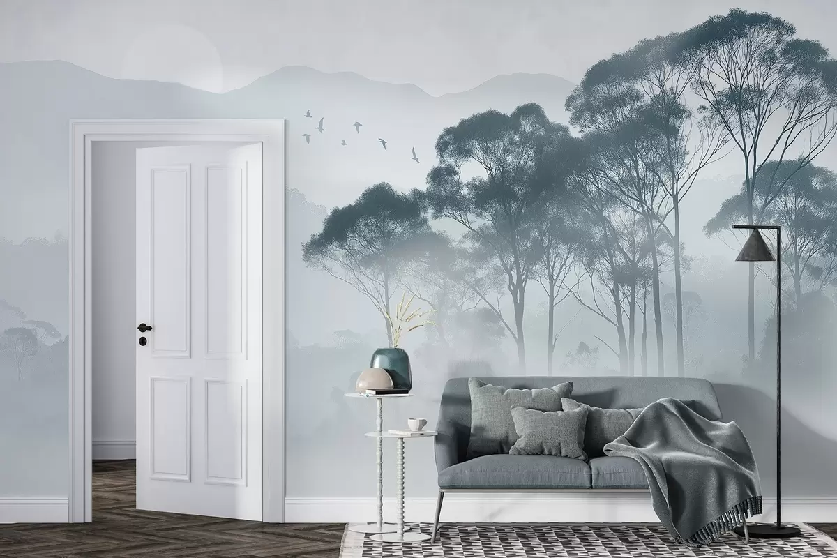 Fototapet Copaci în ceață, peisaje naturale, păsări, soare, culori albastre Nr. w02740v1