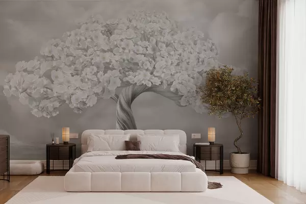 Fototapet Copac mare în flori cu nori în fundal în culori pastelate Nr. w02748v1