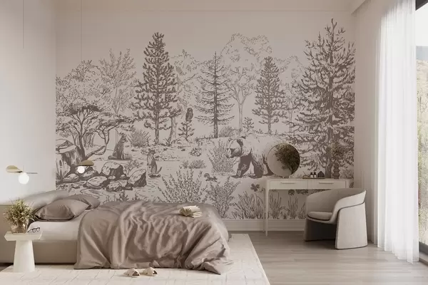 Fototapet Viața pădurii, copaci, animale sălbatice, urs, vulpe, bufniță, tufișuri, desen în stil creion, culori bej Nr. w02929