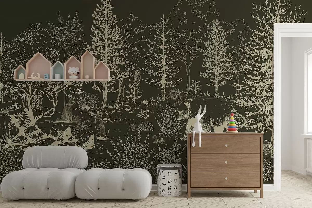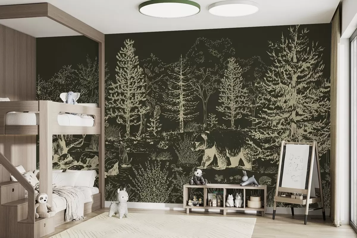 Fototapet Viața pădurii, copaci, animale sălbatice, urs, vulpe, bufniță, tufișuri, fundal verde închis Nr. w02929v3