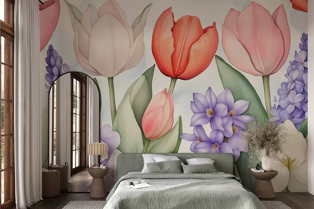 Fototapet Flori de primăvară, lalele, hiacint, desen în stil acuarelă, floral Nr. w02940