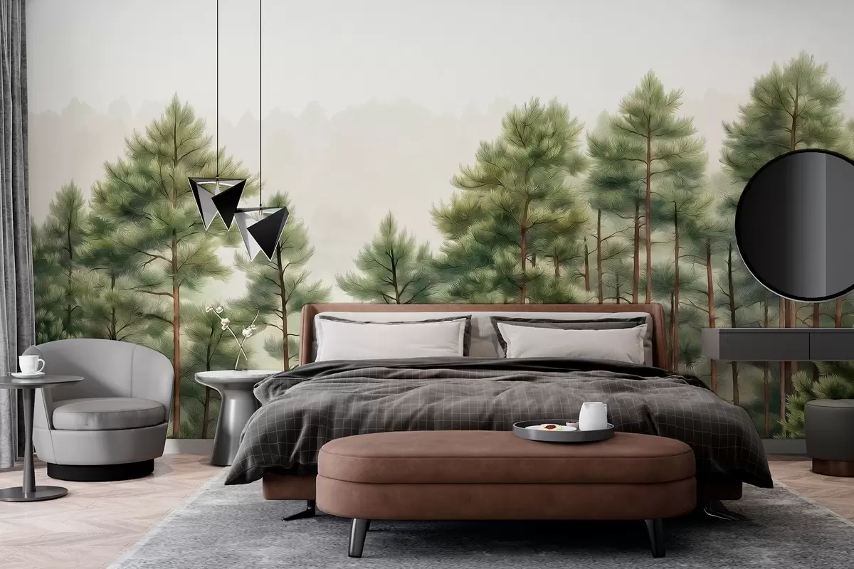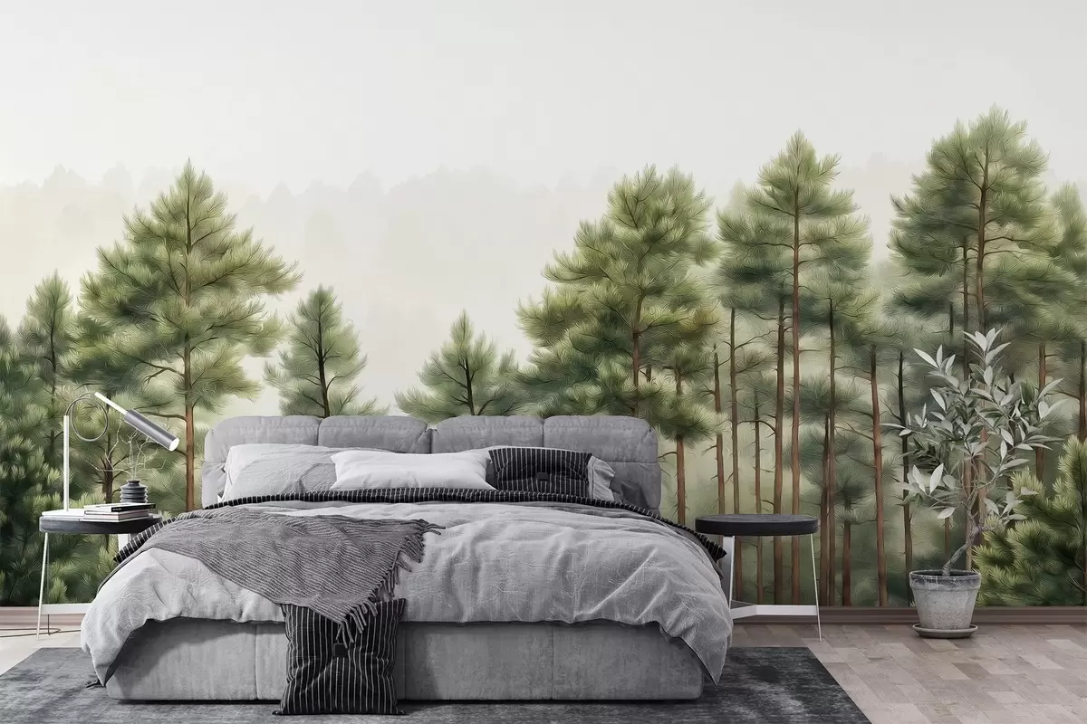 Fototapet Pădure cu pini, desen în stil ulei, natură Nr. w02942