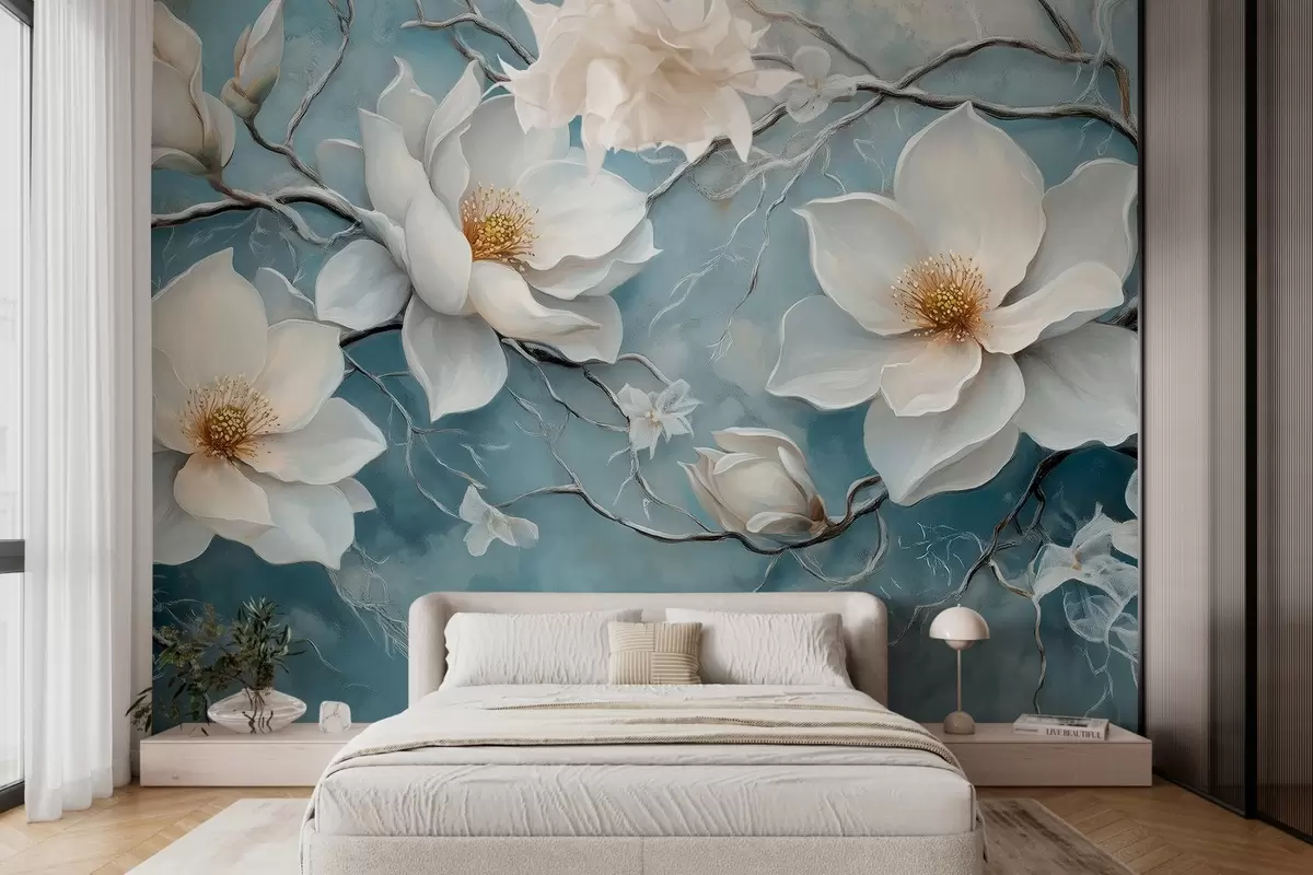 Fototapet Flori albe înghețate pe un fundal albastru în stilul picturii în ulei Nr. w03018
