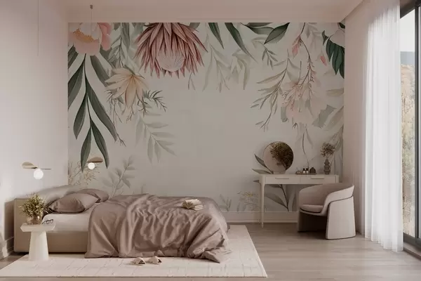 Fototapet Floare Protea printre diverse frunze și plante în tonuri calde de bej și verde Nr. w03019